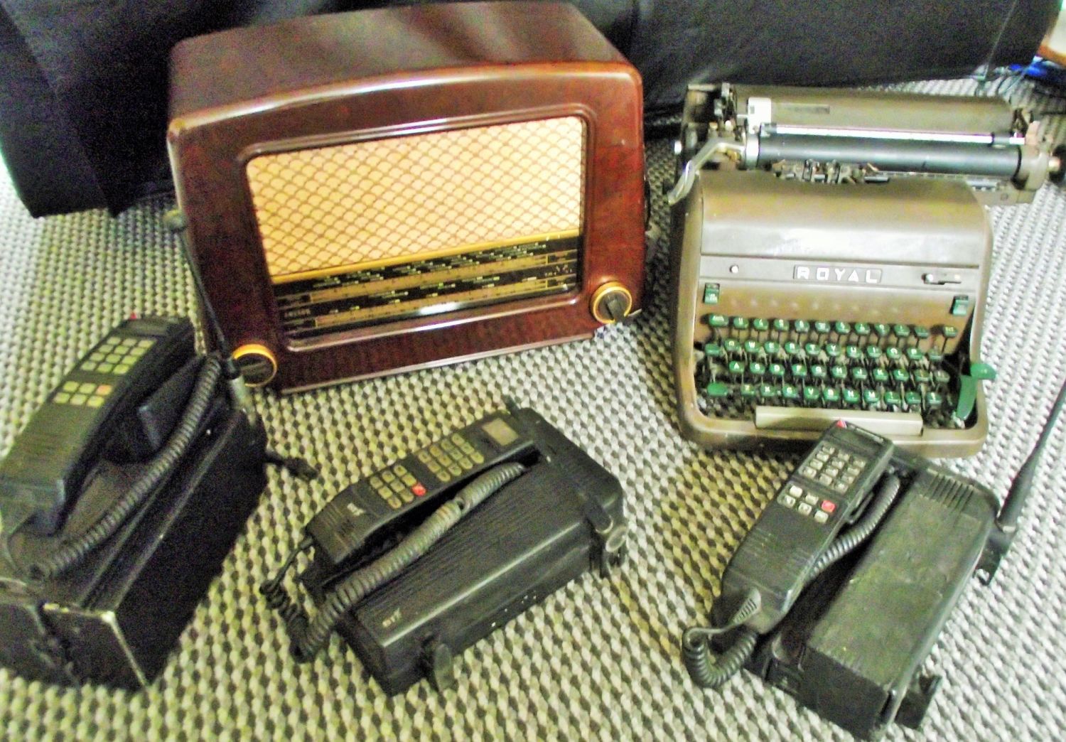 Mixed lot inc. 2x Vintage Collectable Motorola 4800X Cellular Mobile Phones 1980s+ 1 other BT cellular phone + vintage 1955 Cossor radio + Vintage Royal typewriter