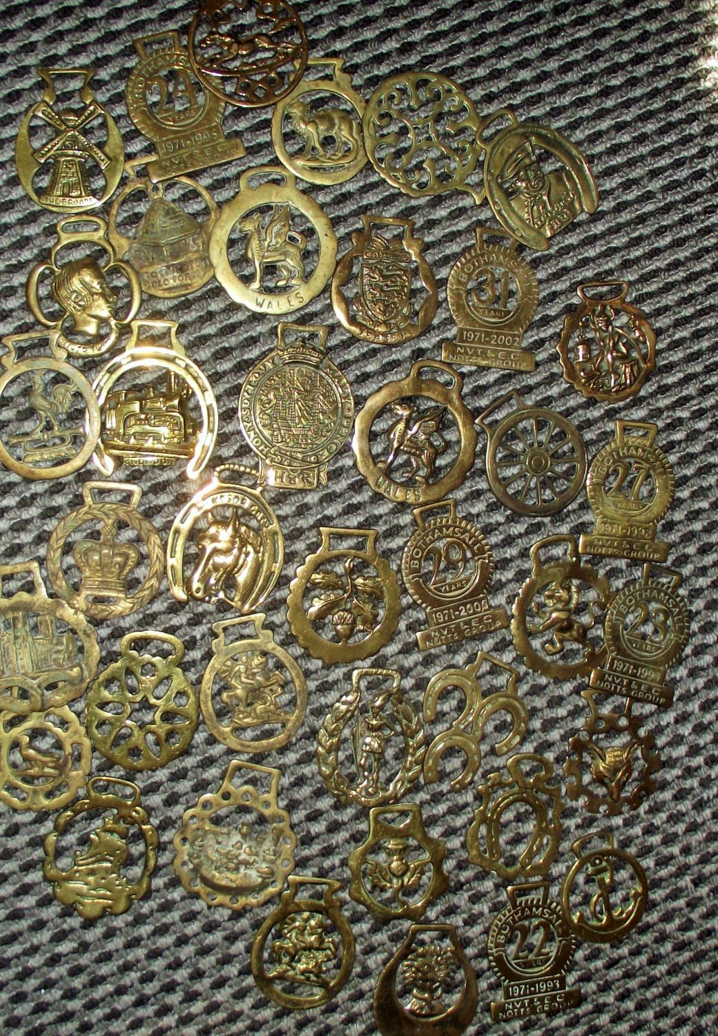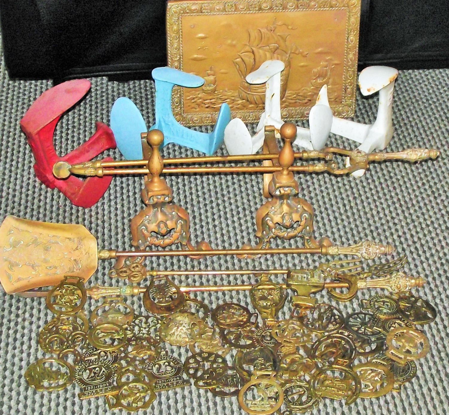 Brass Fire irons & fire dogs, brass picture ,4 painted shoe lasts , 40 + horse brasses & several brass door knockers