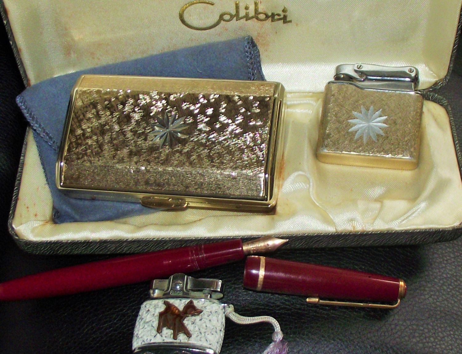 Vintage burgandy Parker no 10 Duofold 14k nib fountain pen +Vintage colibri lighter & vanity case in original box + small pacific lighter