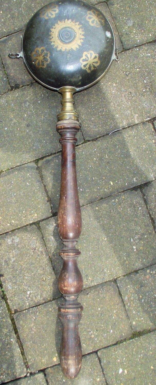 Rare unusual Victorian bed warmer with inlaid brass pattern on mahogany handle