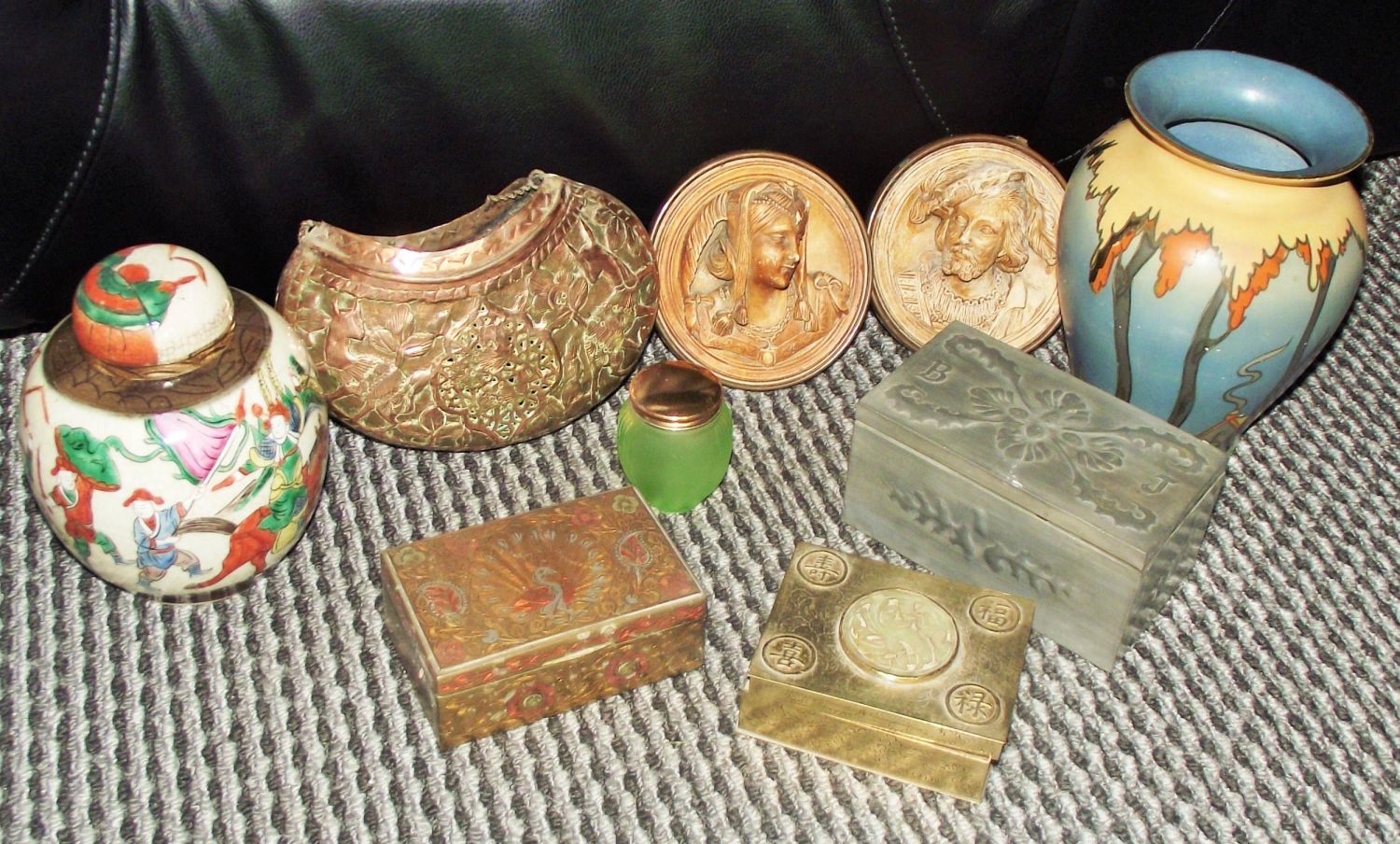 Oriental ginger jar + copper embossed wall hanging pocket , pewter embossed box ,inlaid oriental box + 1 other ,2x plater portraits mounted in brass frames etc