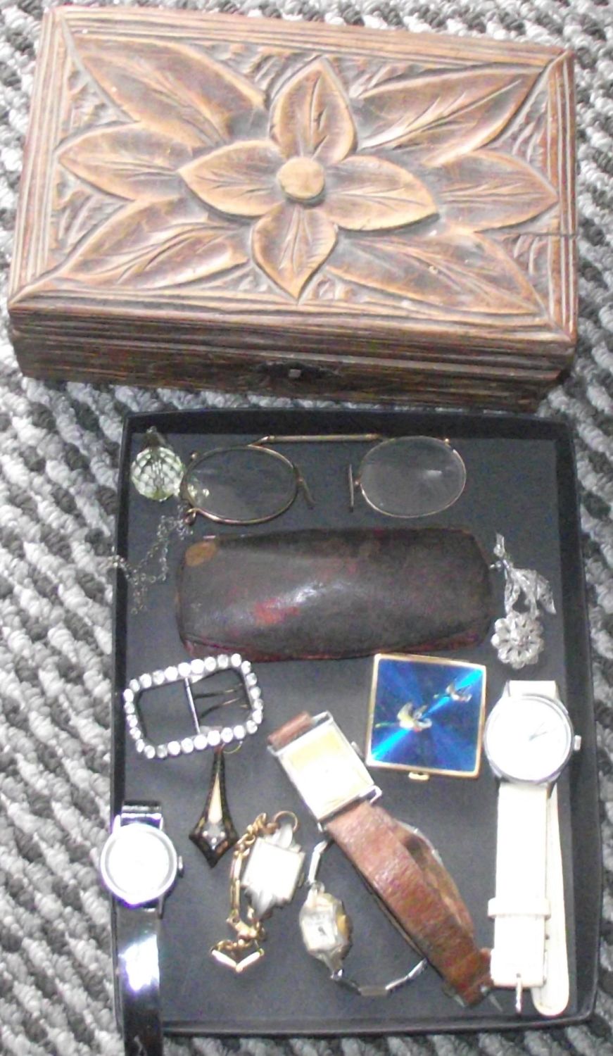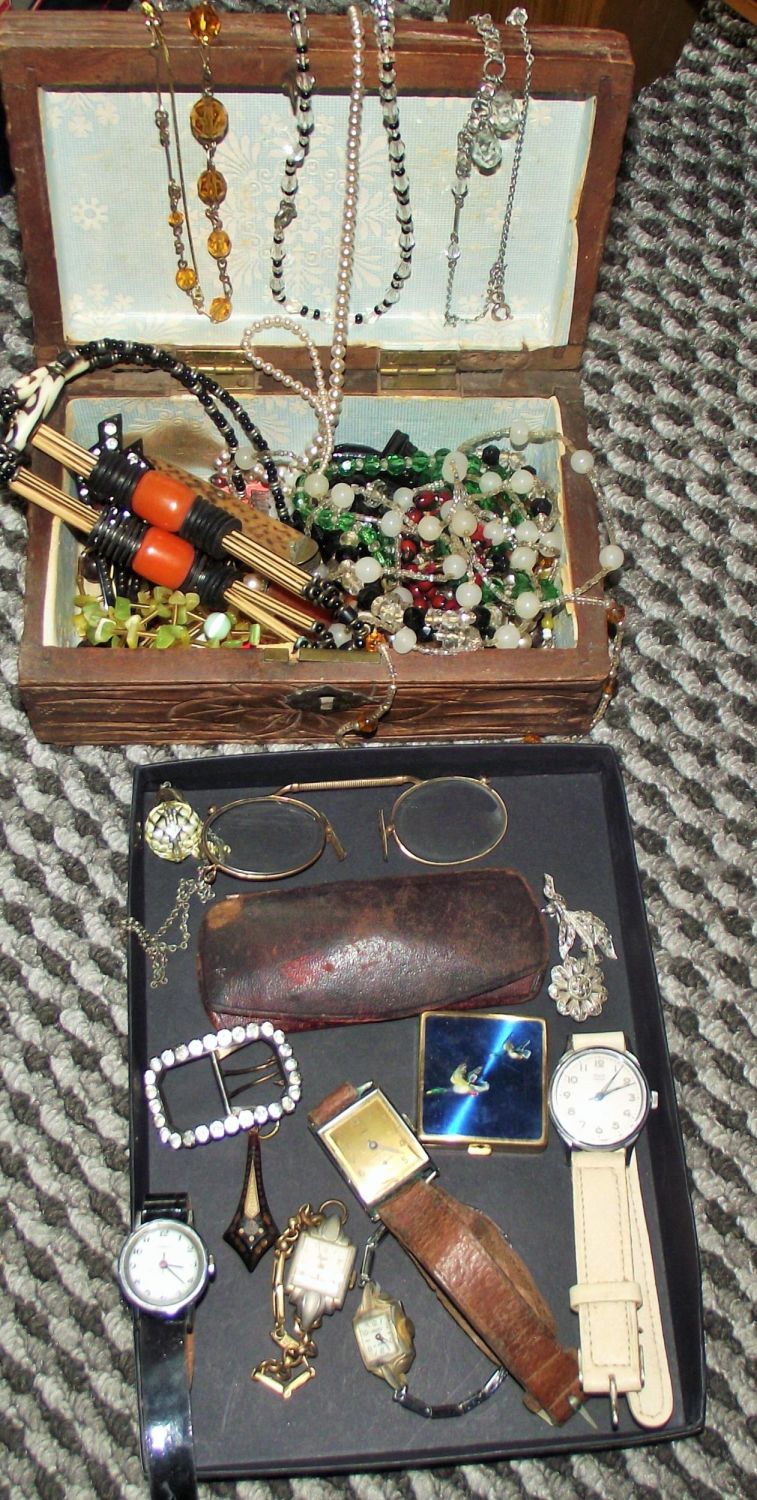 mixed lot inc costume jewellery in lovely carved wooden box + pair of gold plated vintage specticles & case + enamel fronted vintage pill box + vintage buckle + selection of vintage watches inc.oris ,Union soleur , timex , remley etc