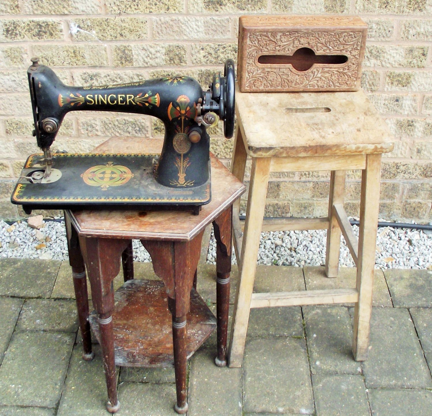 singer sewing machine + small hexagonal side table + carved slottet top box + vintage slotted top stool