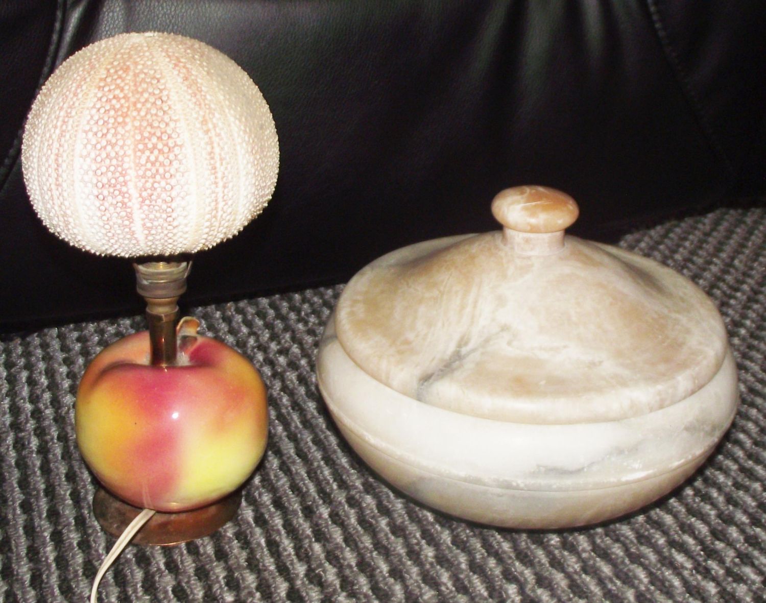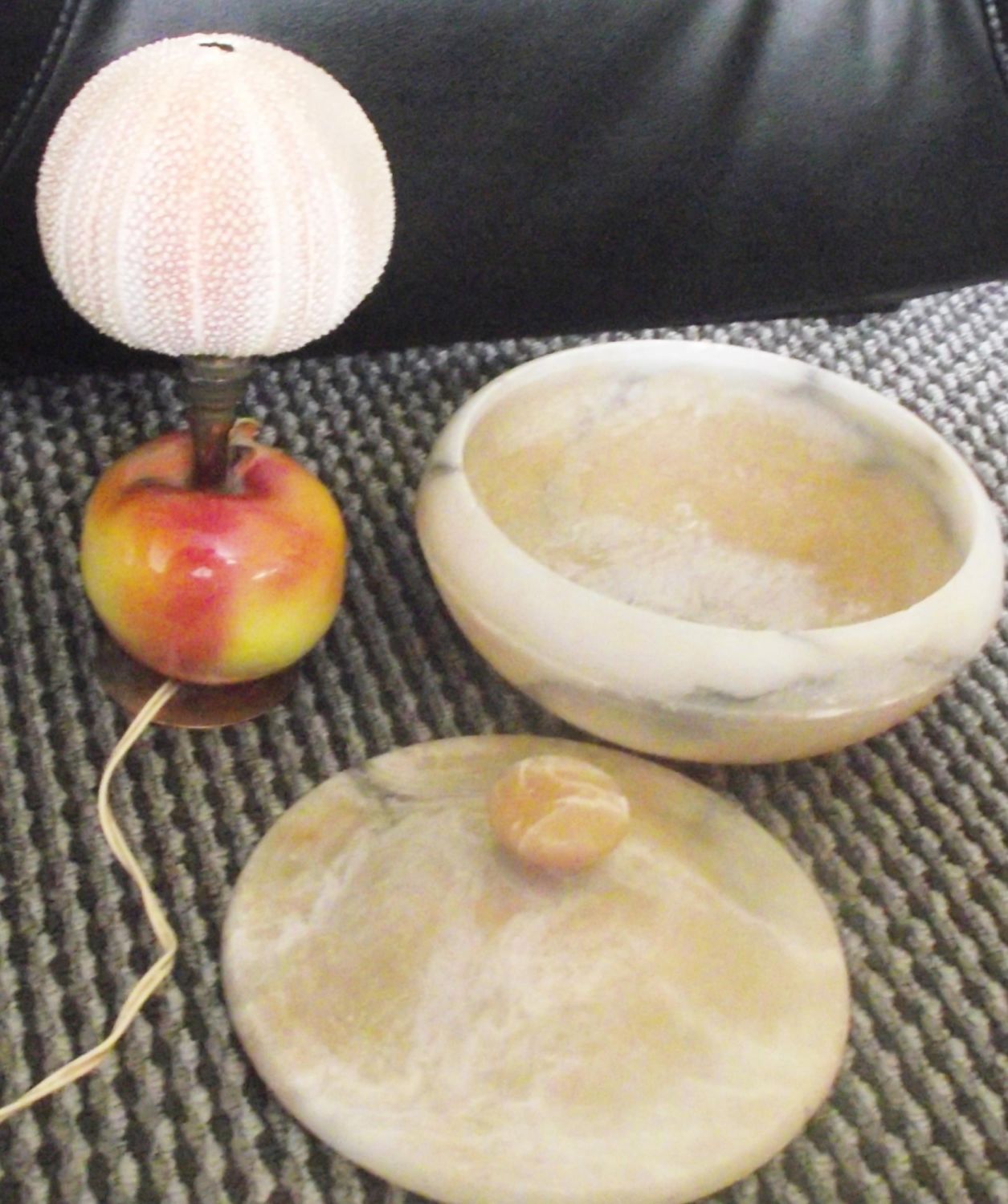 large vintage 1930s Italian Alabaster marble lidded bowl 8" diameter 7" high to top of knop on lid + unusual Vintage sea urchin shell table lamp with real sea urchin shell mounted on brass stem with ceramic apple base . 10" high approx