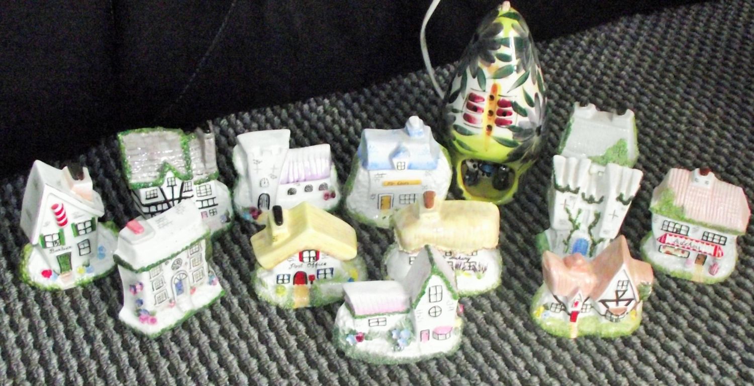 Collection of 12 x Little English miniature buildings Crown English collection + Derek fowler studio pottery lamp