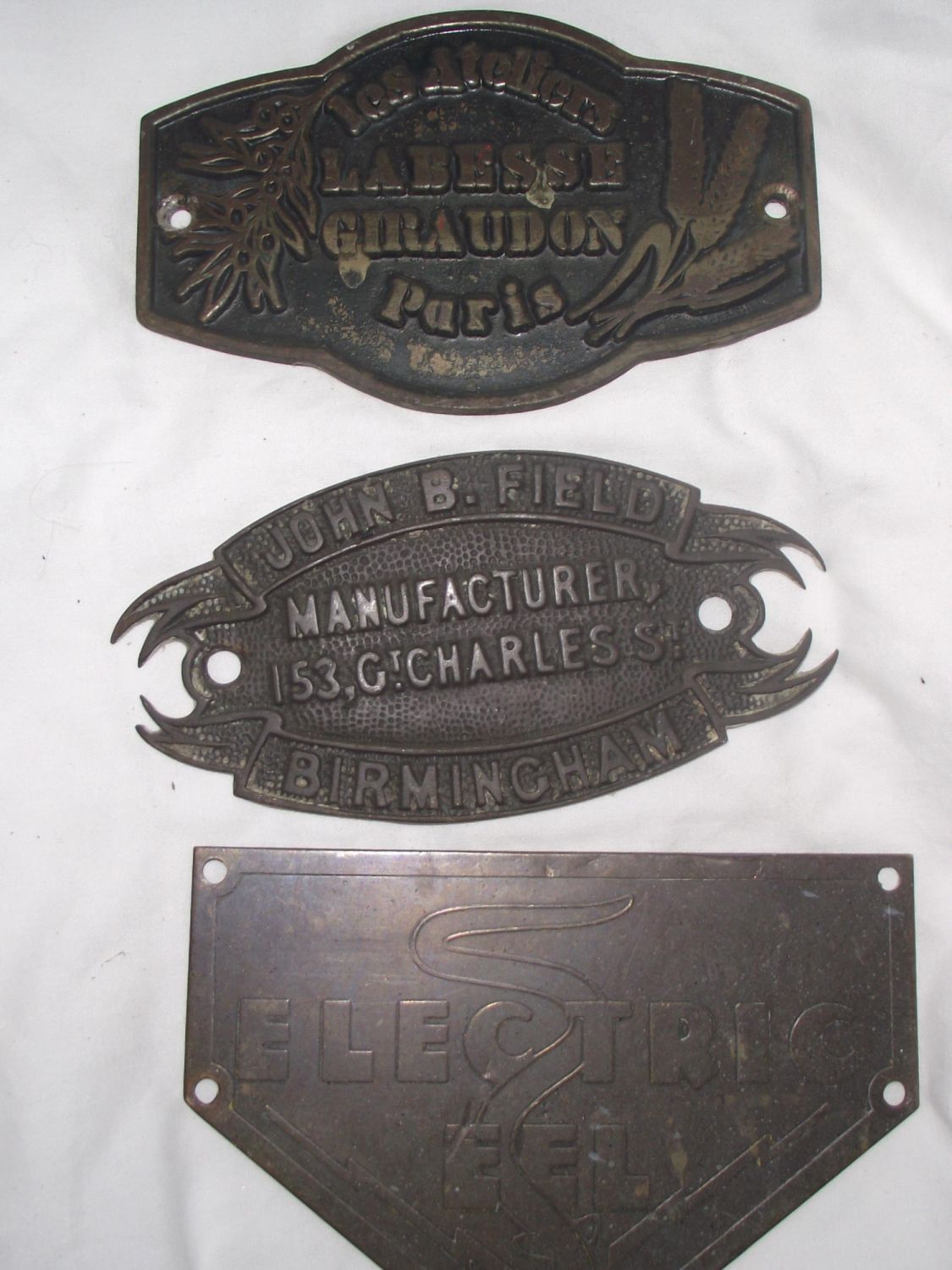 3 x Vintage brass company avertising plaques Electric Eels 6×4" + John B Field manufacturer 6x 3" + Les Ateliers Paris6x3.5" approx