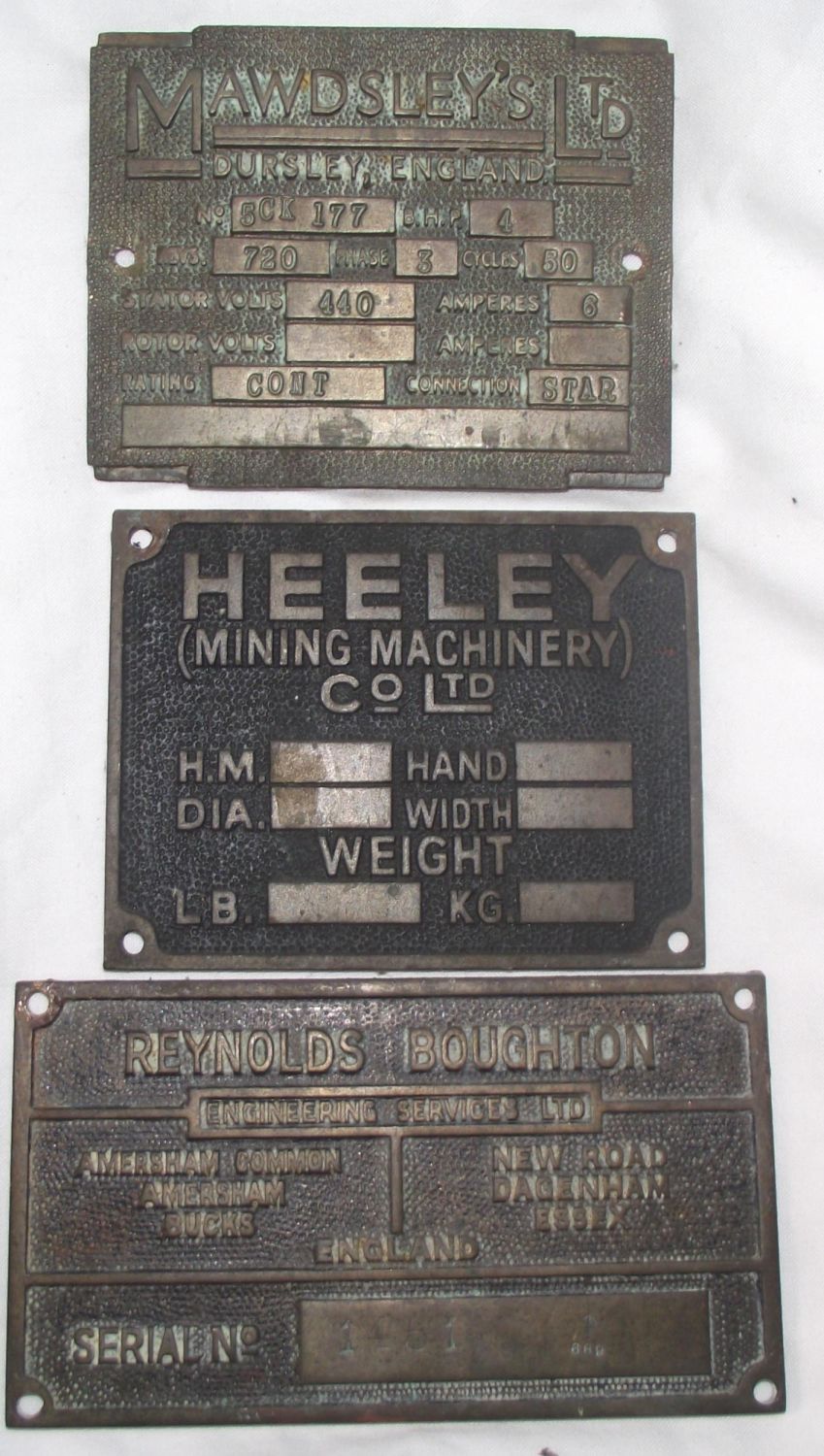 Vintage brass company advertising plaque ( Heeley mining machinery co Ltd ) 4×3" approx + Brass Reynolds Boughton Engineering services Ltd 5×3" approx +Mawdsley Ltd Dursley England 3×4" plaque