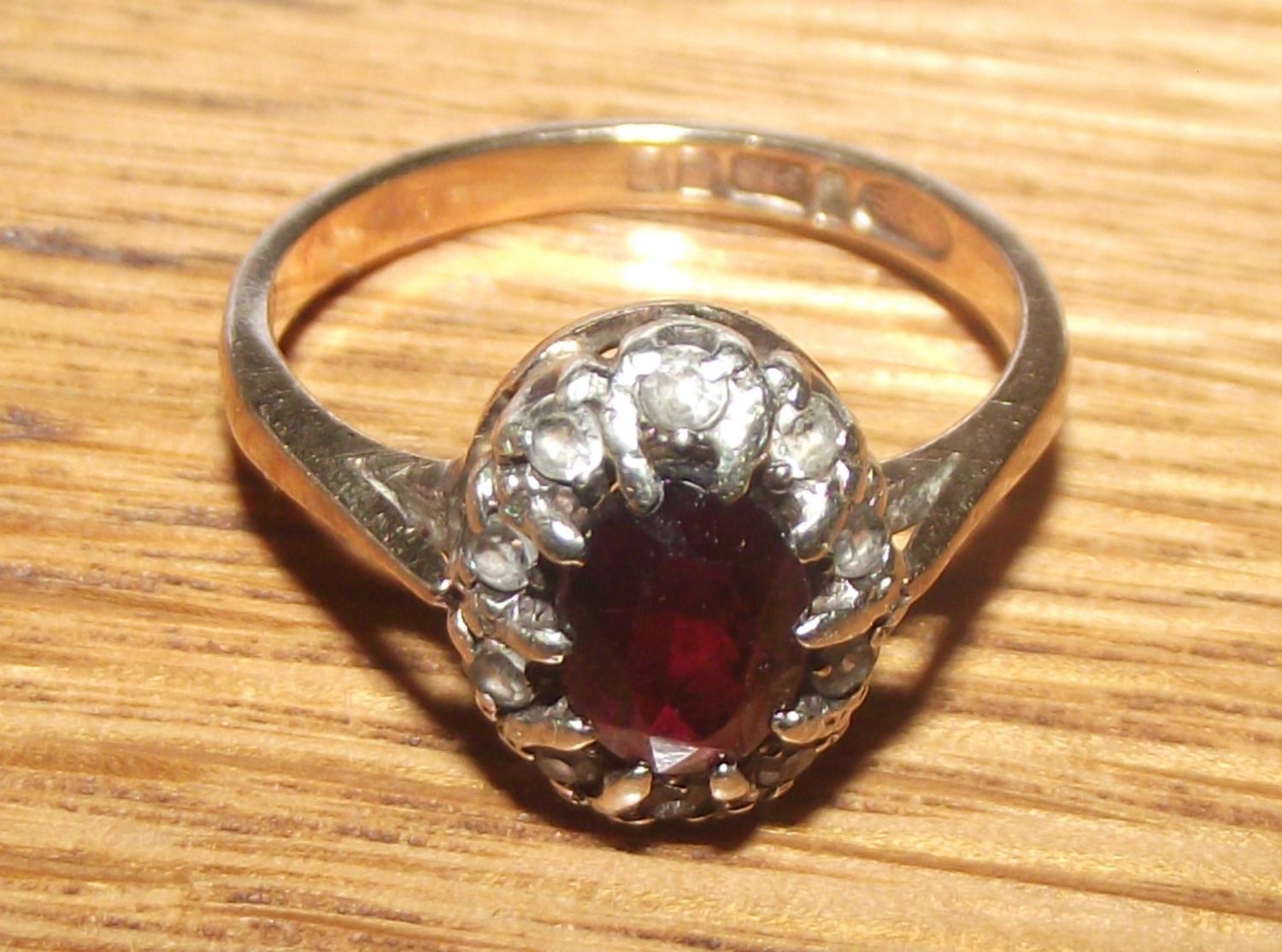 Ladies 9ct gold ring set with central garnet stone surrounded with small chip diamonds 2.8g approx