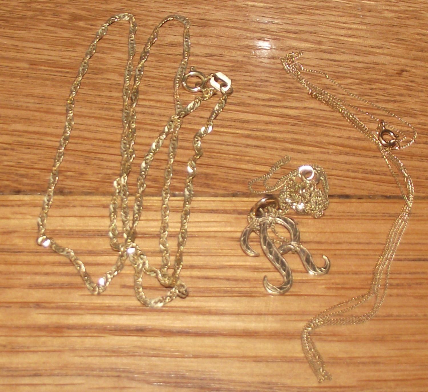 16" 9ct gold twisted rope style chain + thin 16" 9ct gold chain + 9ct Gold letter R ( on 9ct knotted chain) 2.8g approx