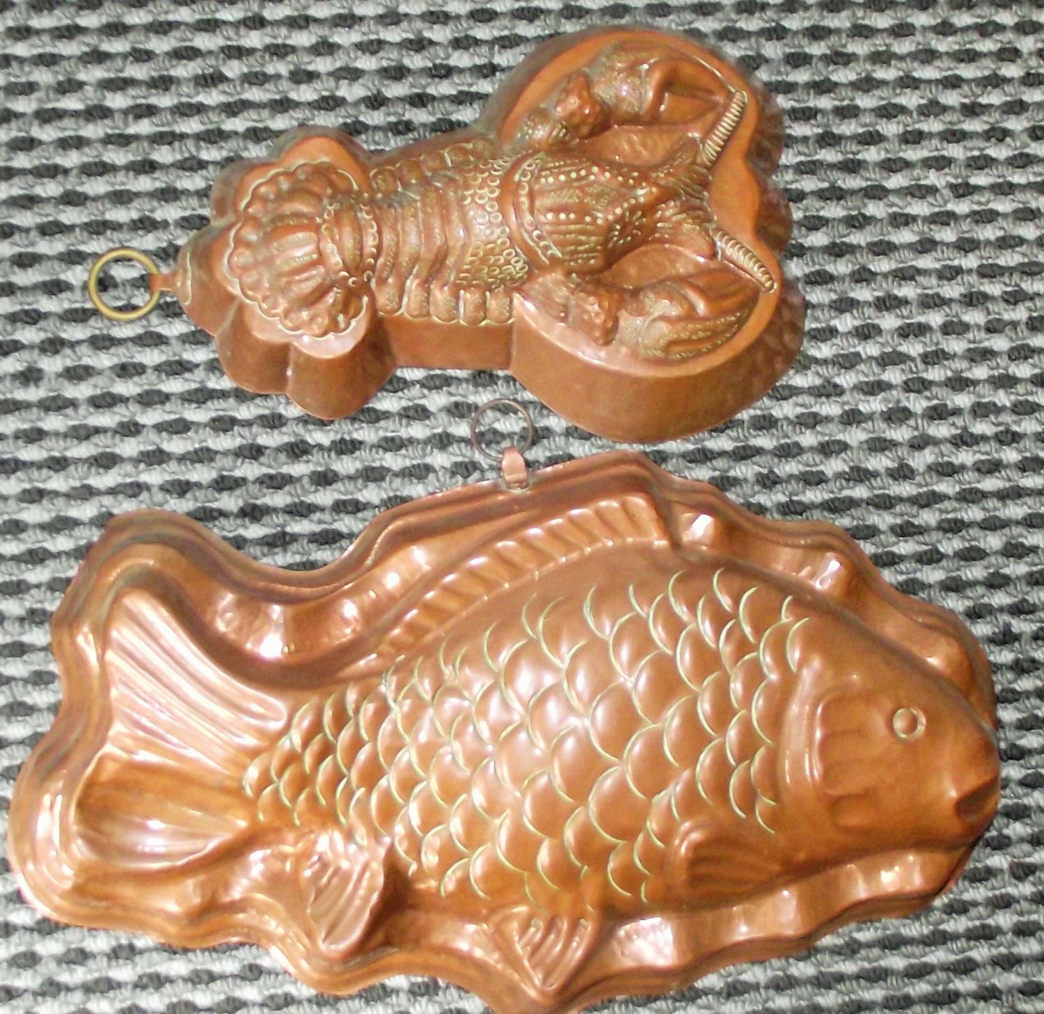 2x vintage large copper jelly moulds carp 10×8" & lobster 8×10" approx