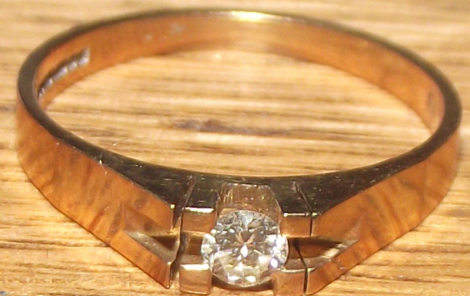 Ladies 9ct gold ring with qualty single central diamond suspended in mount 1.8g approx