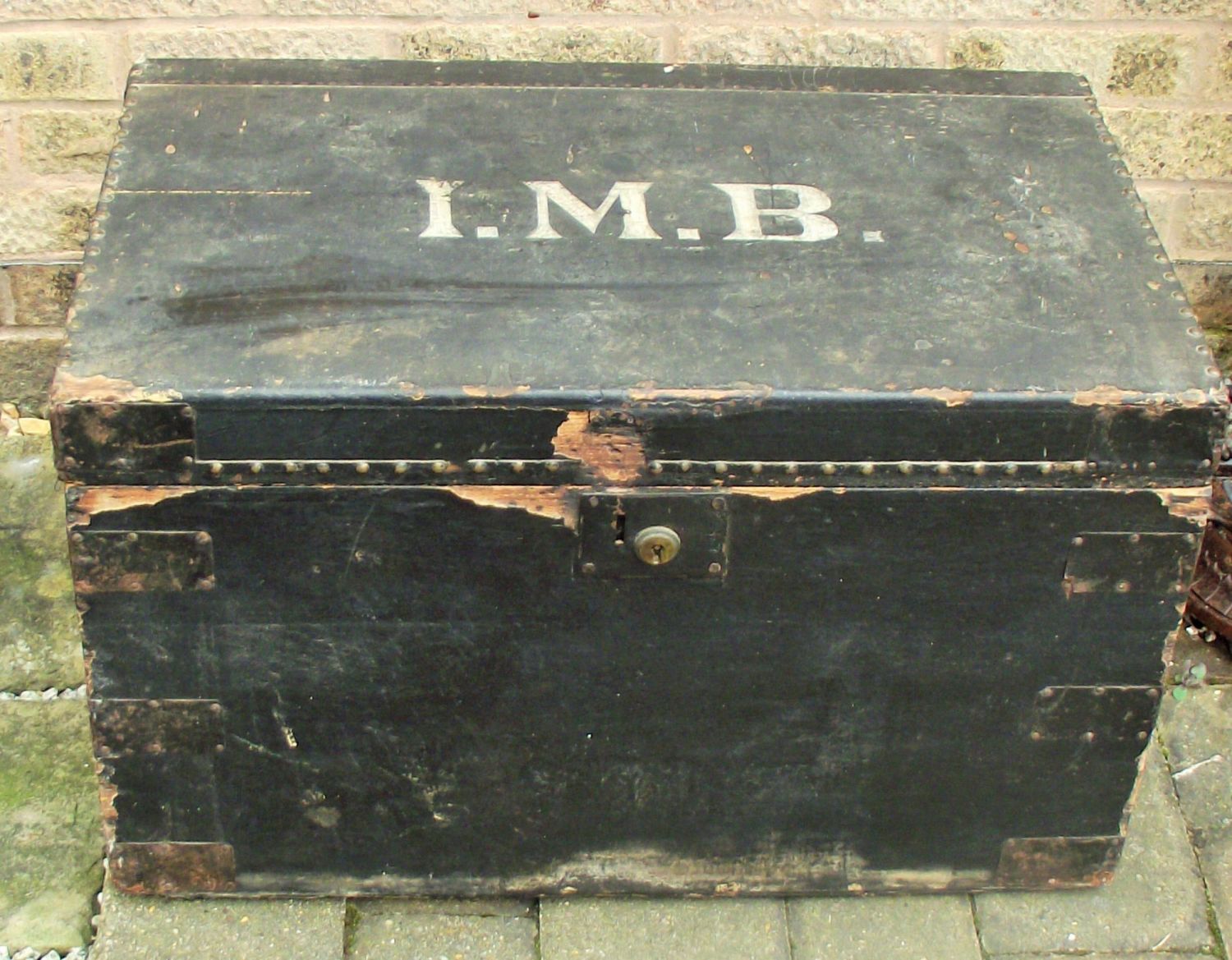 Large Antique travelling / shipping trunk initialled IMB. Made by T W Sheerman 73 north st Brighton . Original label inside