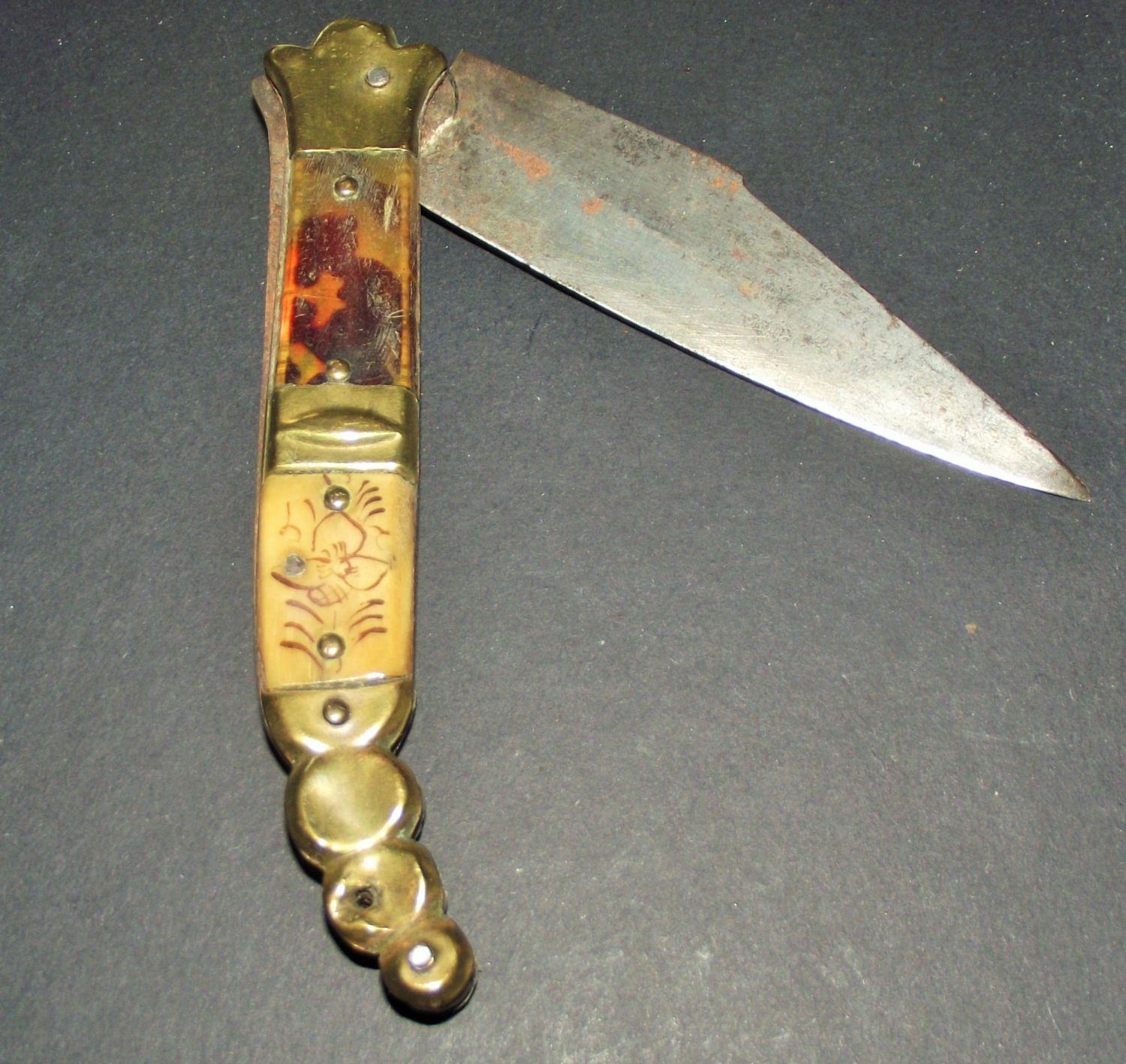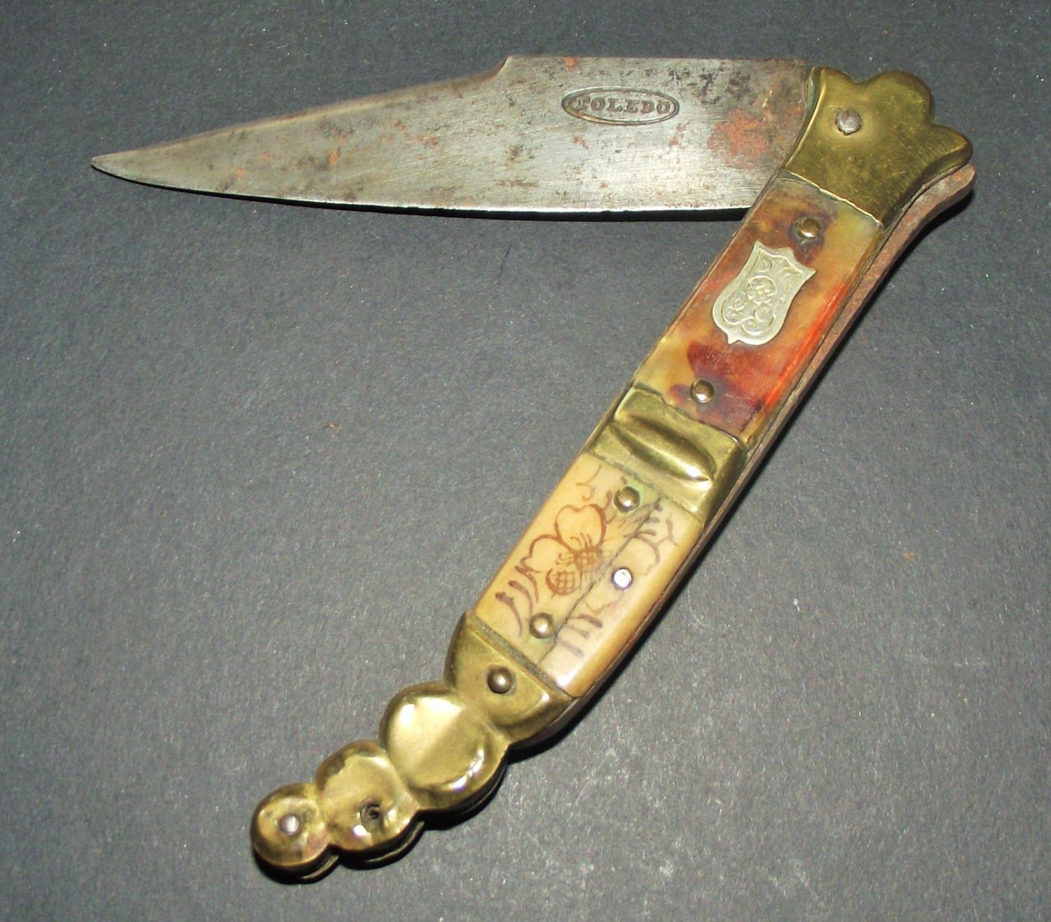 Late 19thc Spanish folding knife blade marked Toledo the hilt of stained horn, brass& bone