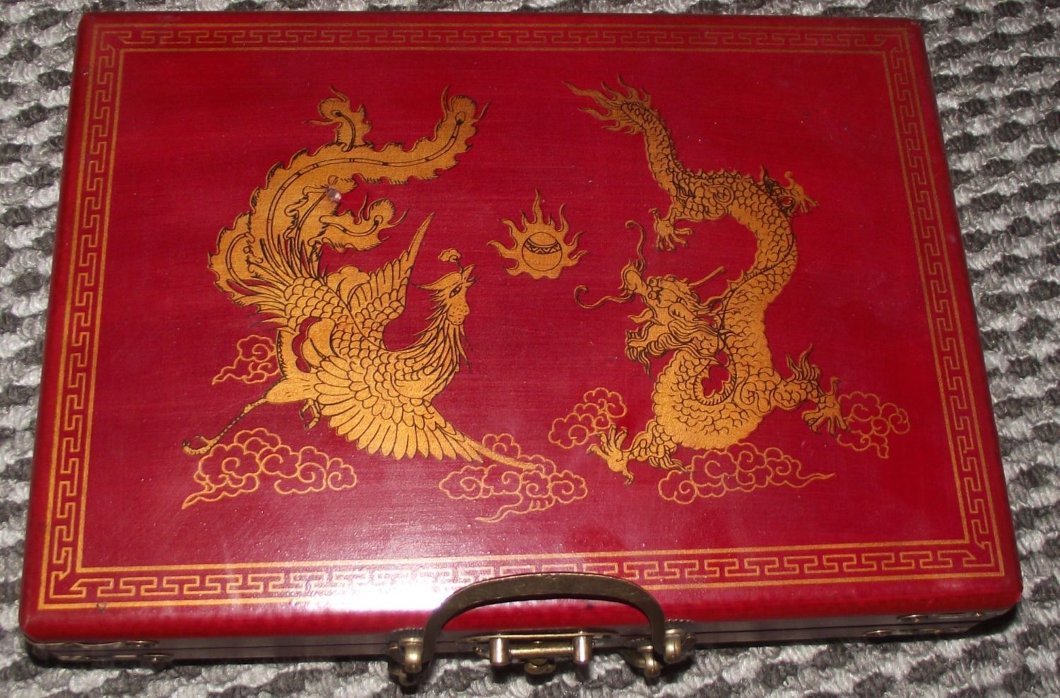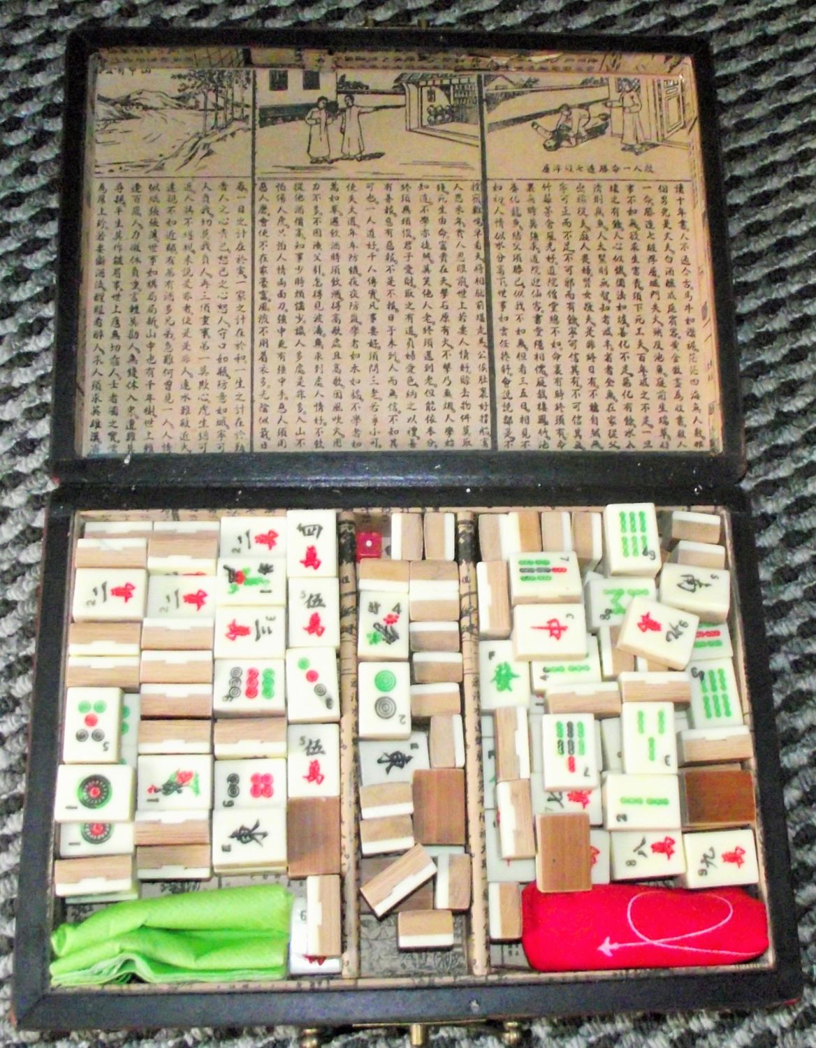 Vintage Chinese May jong set with bamboo pieces in red leather case