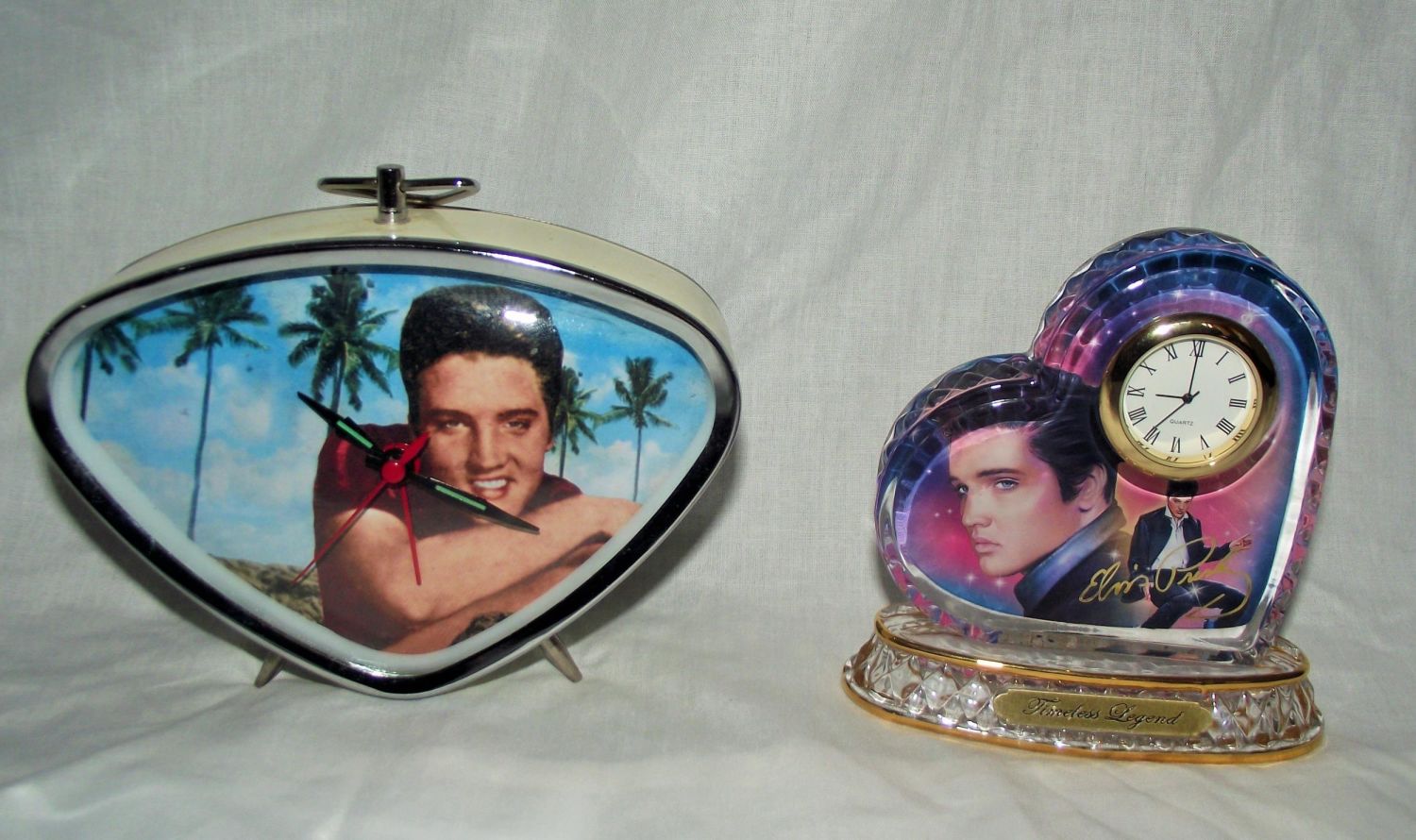 Elvis quartz crystal clock ( timeless legend heart clock ) bradford exchange Ltd edition No A1128 boxed 4.5×4" + 1960s style alarm cock ( working) manual wind 6×5" approx