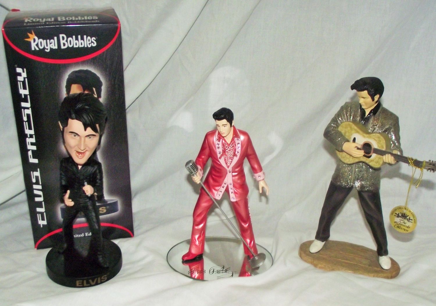 Elvis figurines inc Pink reflections ( all shook up for the cause A1294 8"high approx no box) +Leonardo silver coatElvis 1997- 9" high approx no box + Elvis royal Bubble head Ltd edition 8" boxed. All in good condition