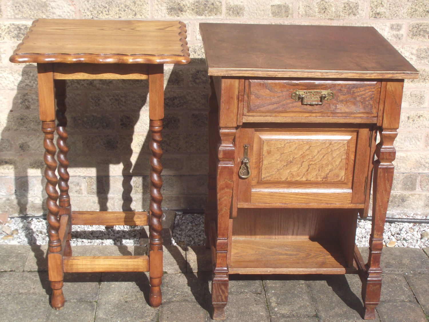 Small Edwardian bedside table with single draw and cupboard below with replacement top + Barley twist legged small occassional tale with square pie crust edged top