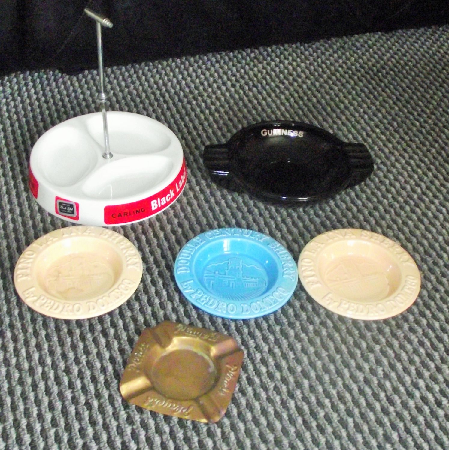 Wade 1930 deco style Carling Black label Lager Beer advertising ceramic 3 partion dished bowl with central carry handle + 3 Double Century Sherry advertising ceramic ashtrays + Black pressed glass Guiness ashtray produced for Arthur Guiness by Nazeing glass works hertfordshire + brass Player cigarette ashtray