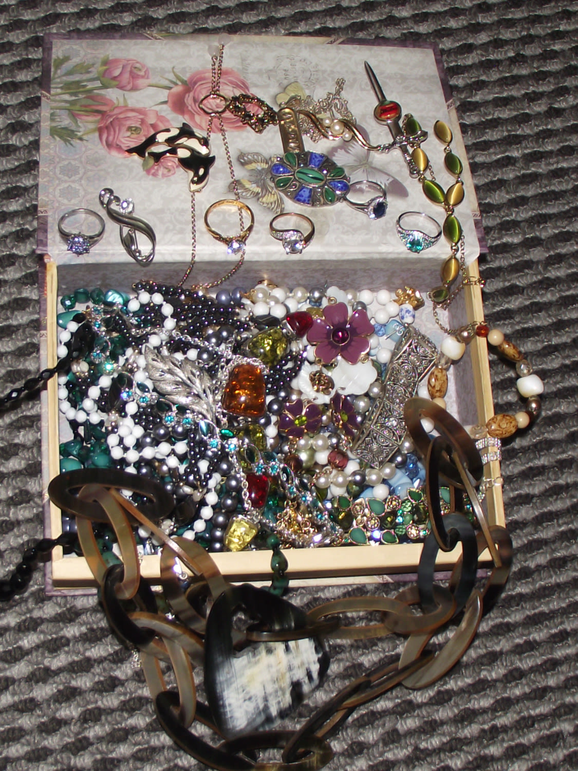 Good box of assorted costume jewellery inc dress ring , beads pins, brooched and a necklace made from horn