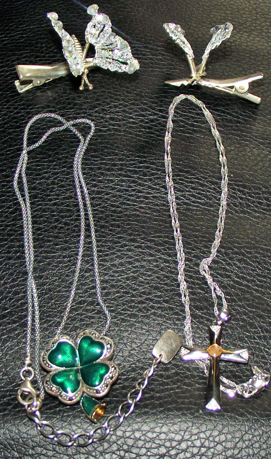 silver & enamel 4 leaf clover on silver chain + Silver cross ith 18k gold plated accents 4 small diamonds and centre filled with real sand from Sea of Galilee beach Israel with certificate of authenticity + unusual pair of base metal butterfly hair clips mounted on smal springs allowing them to articulate