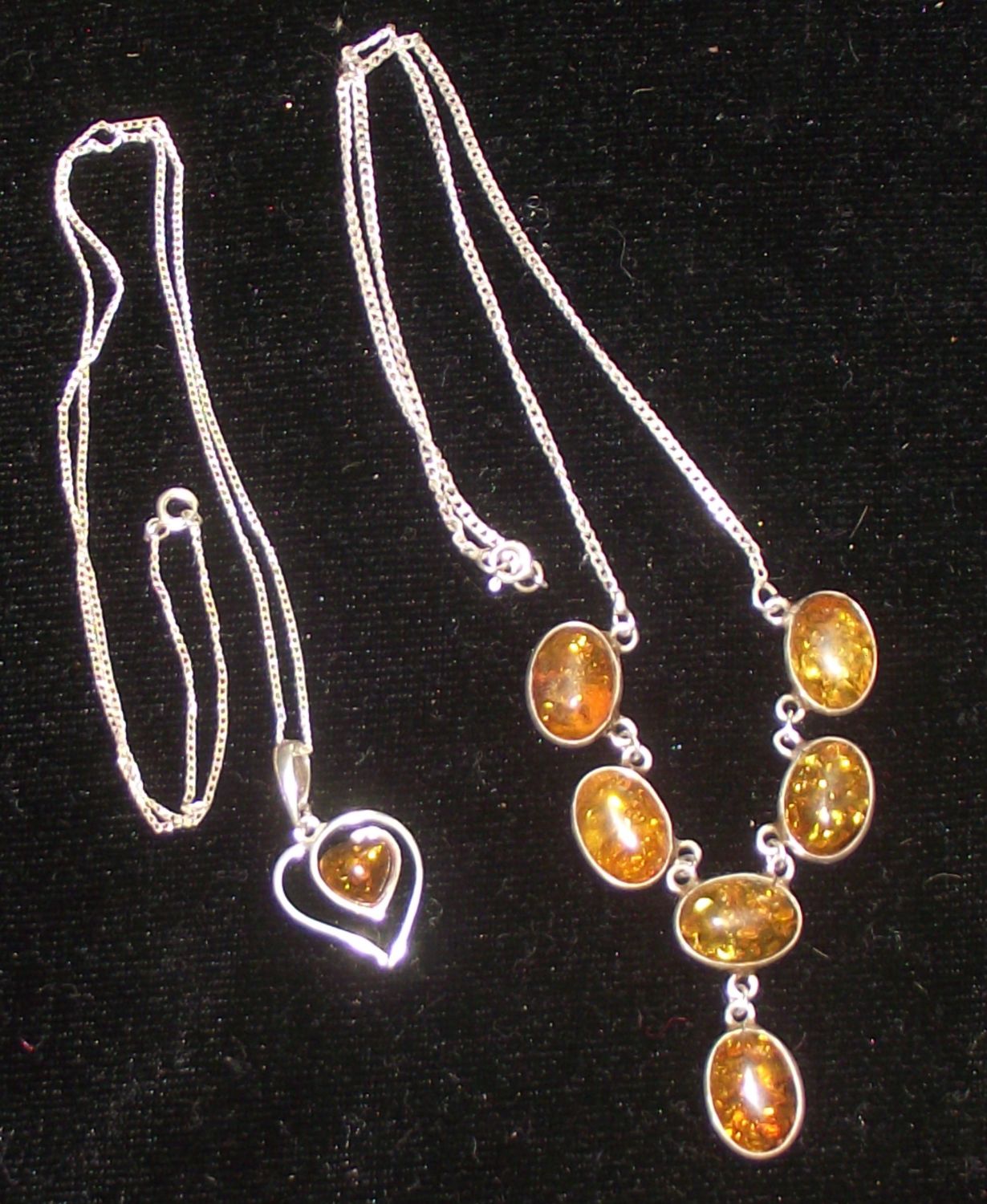 2x 925 silver necklaces with amber style settings one in a heart shape on siver chains