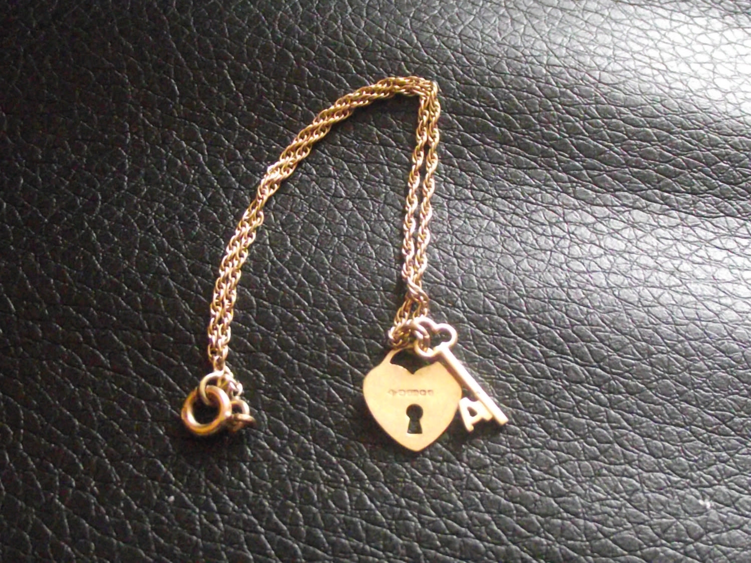 9ct gold ladies 7″chain bracelet with 9ct gold lock&key charm 1.2g approx