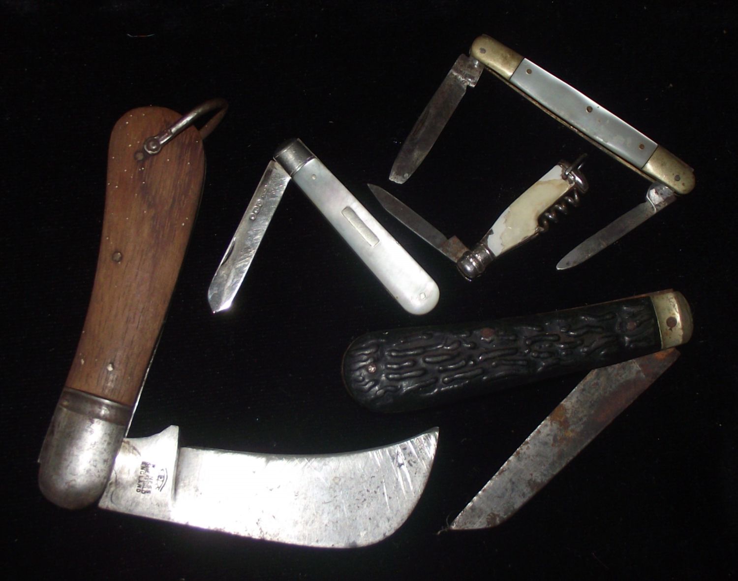 Group of assorted penknives / pocket knives including Sterling silver moher of pearl fruit knife Sheffield 1922,Winess sheffield pruning knife S j Howard lamb foot pockrt knife , 2 other mother of pearl handle penknives.(5)