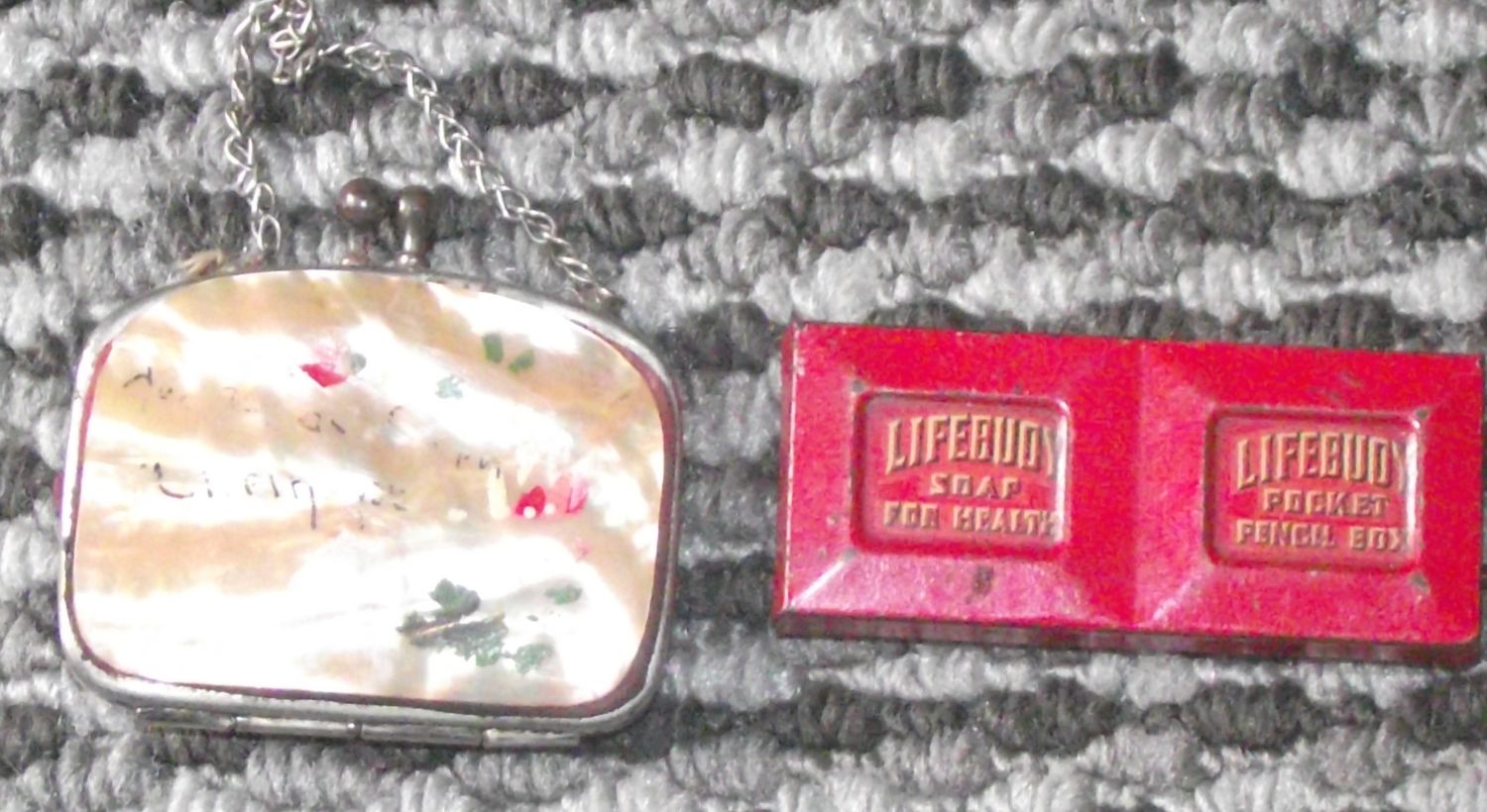 small antique chaterlain style abalone shell fronted purse + Antique lifebouy soap for health pocket pencil tin circa 1910 2.5 inch long