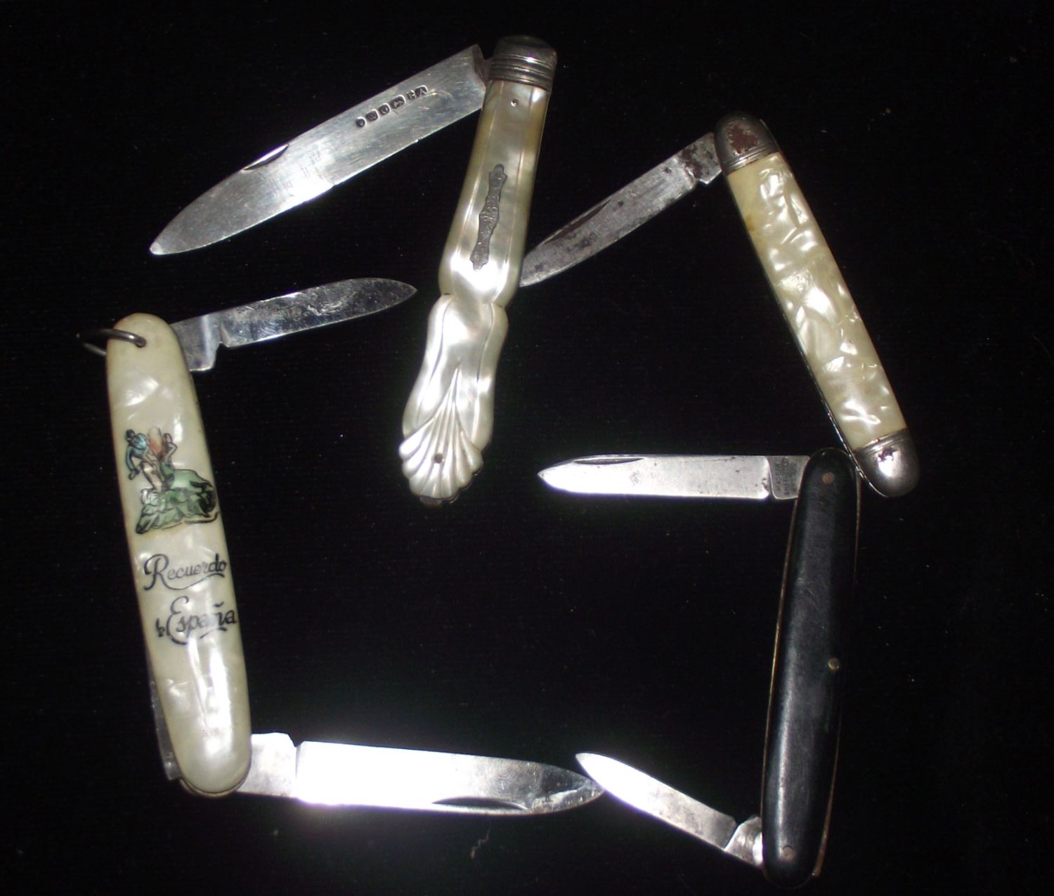 Small selection of pocket penknives including Victorian silver blade 1837 mother of pearl handle , Small Sheffield twin blade ebony style handle ,twin blade spanish pearl style handle , single blade pearl style handle (4)