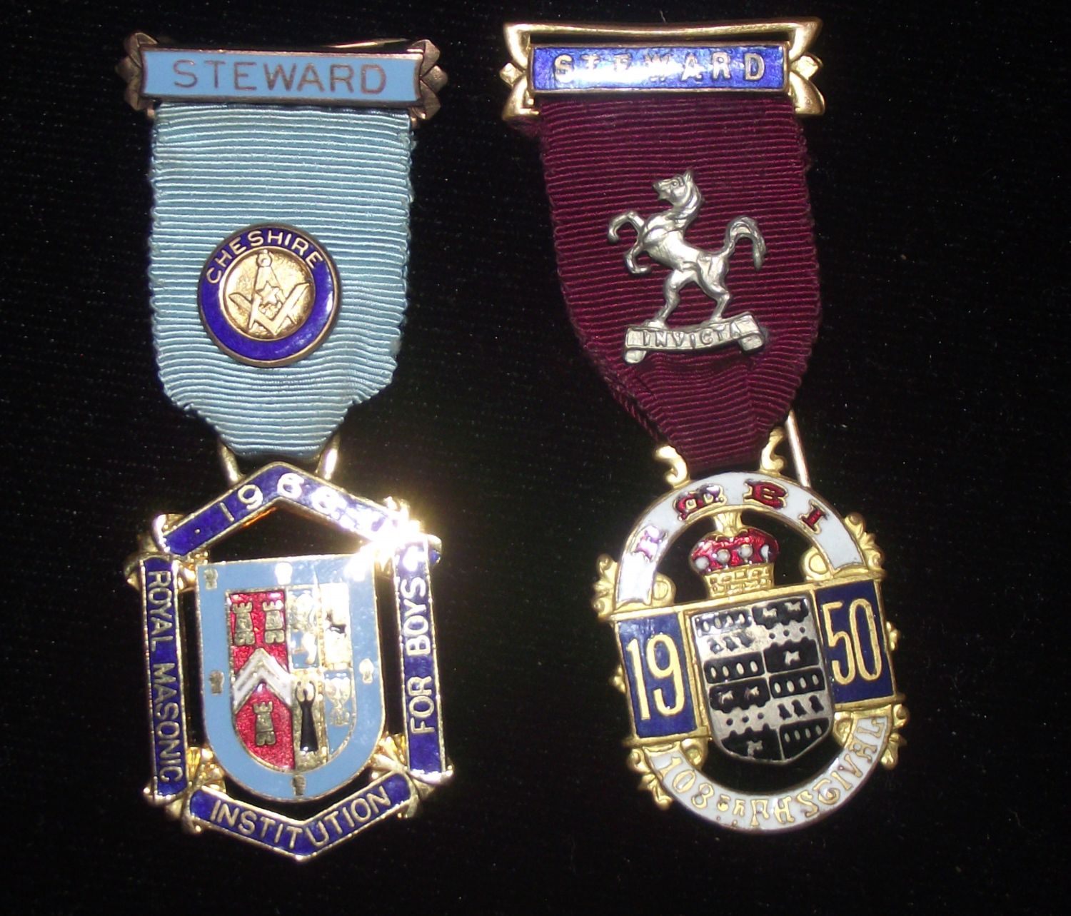 2 x Masonic enamelled Steward medals 1950/1968
