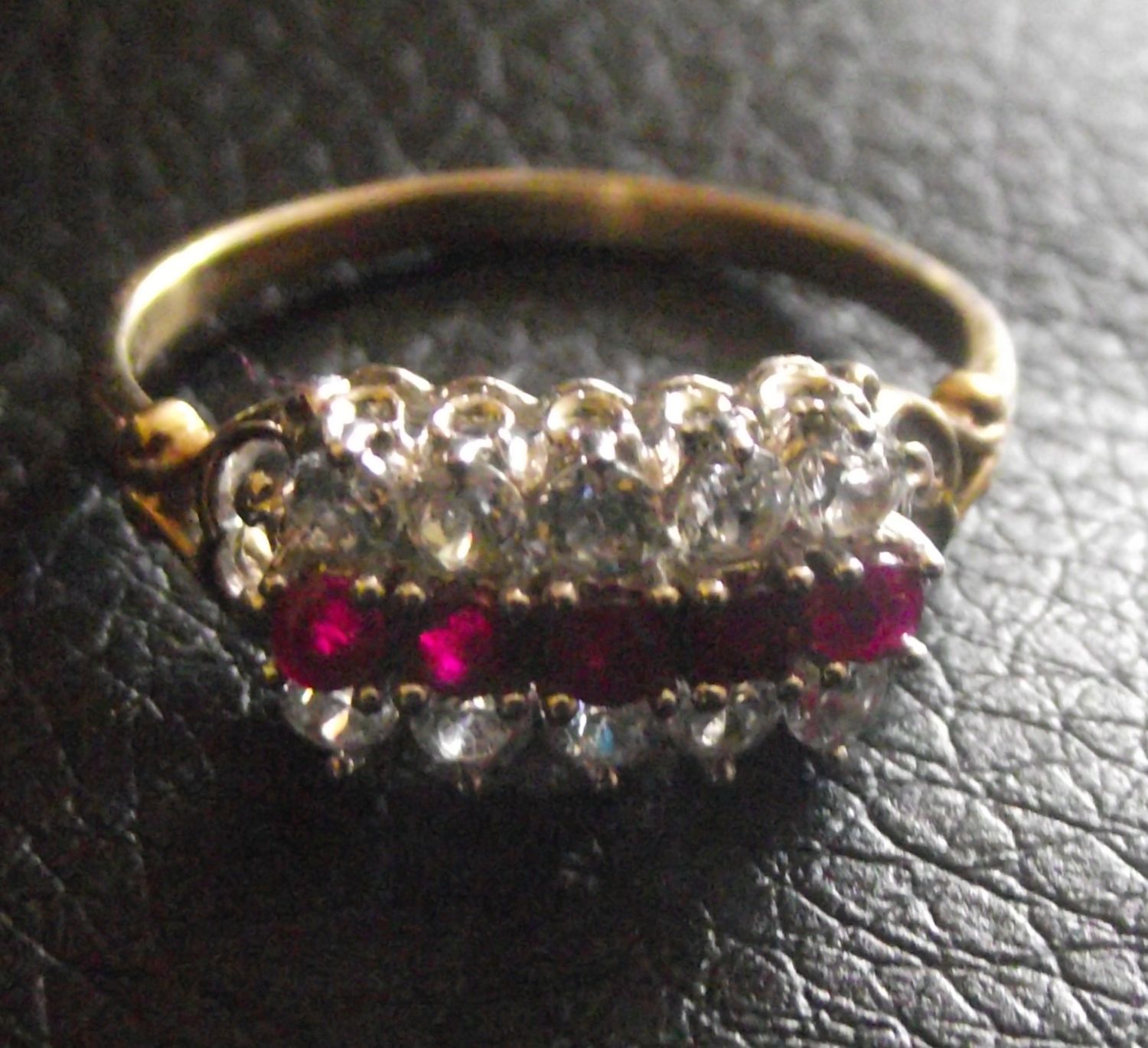 9ct gold ladies ring set with cubizones and red coloured stones in chanells raised on an open scroll shank 2.6g approx