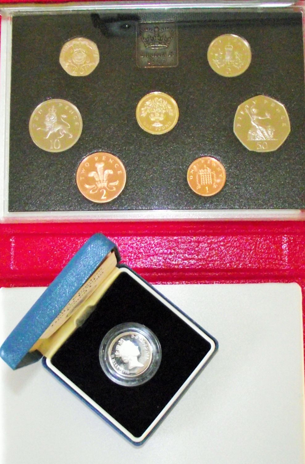 Silver proof £1 coin 1987 sealed in plastic capsule + 1987 sealed mint coin set in leather wallet