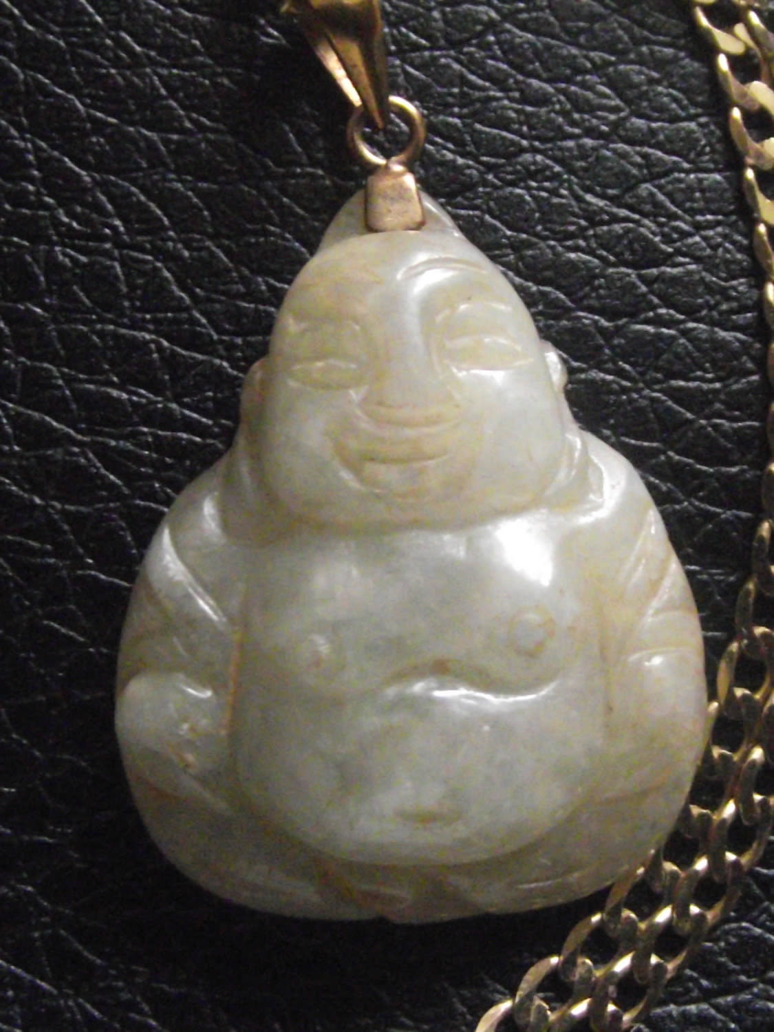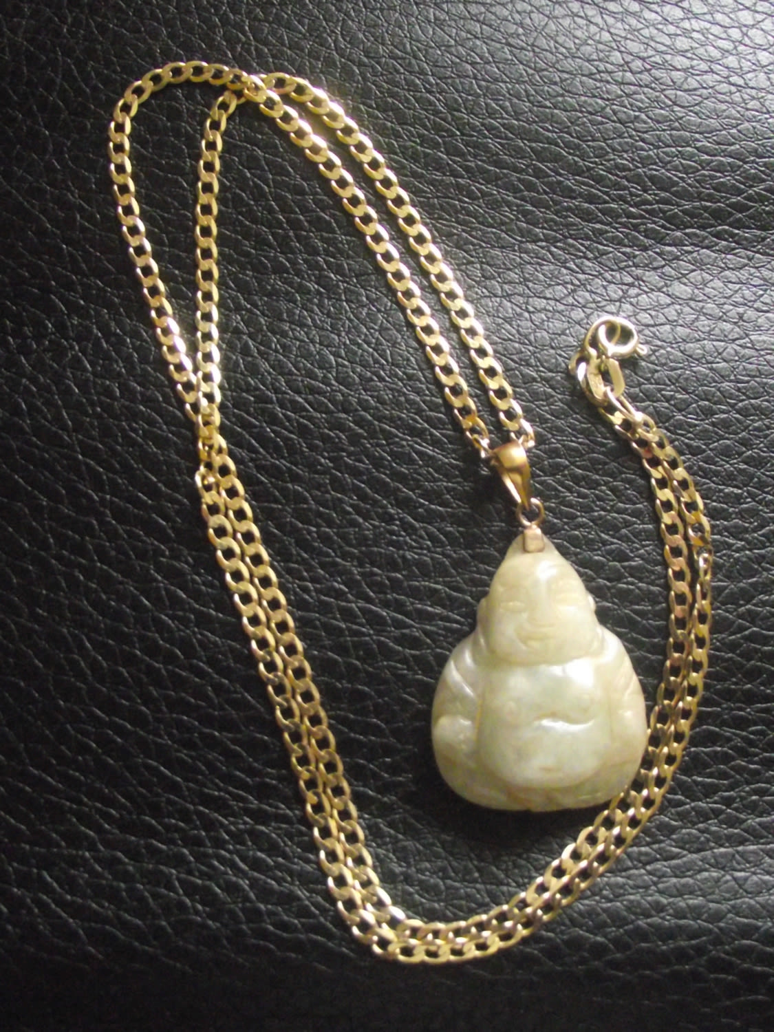 Jade/jadite style carved buddah pendant with 14k loop suspended on a 18″ 9ct gold neckchain ( chain2.5g approx)