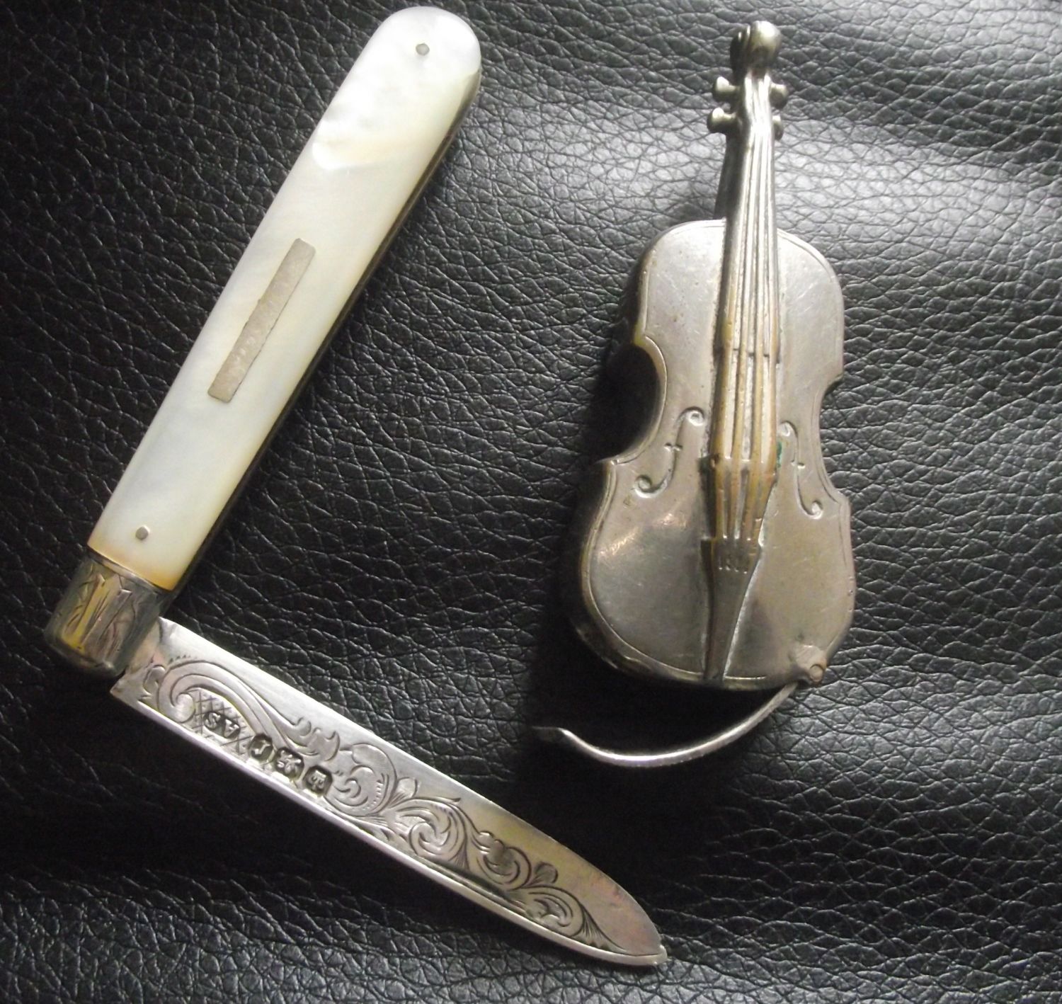 Lovely silver mother of pearl handle fruit knife Sheffield 1895 + white metal vesta case in shape of a double bass