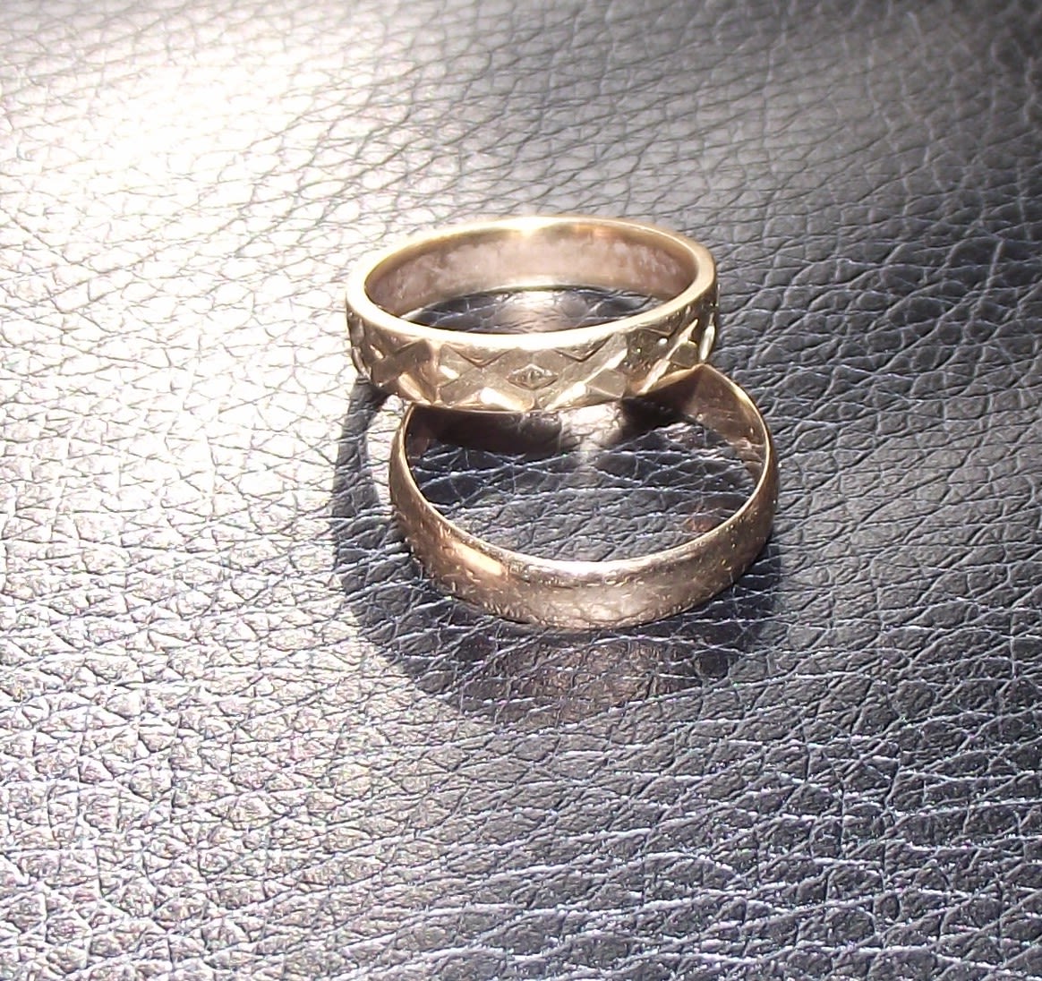2 x small 9ct goldbands 1 plain other with chased decoration 3.5g approx