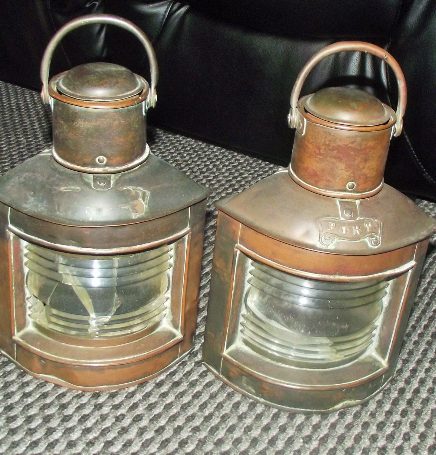 Pair of vintage copper masthead lanterns converted to electric ( damage to glass fronts )