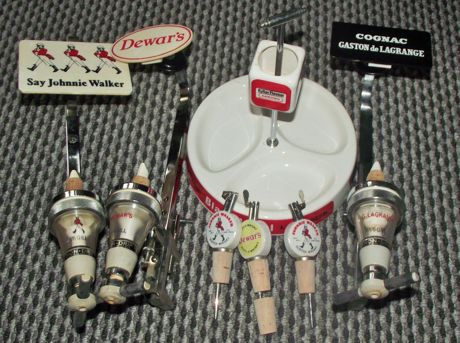Vintage Wade Black label ashtray with matchholder + Johnnie Walker , Dewards & Cognac bottle optics + 2x Johnnie Walker & 1 Dewards spirit bottle pourers & stoppers.