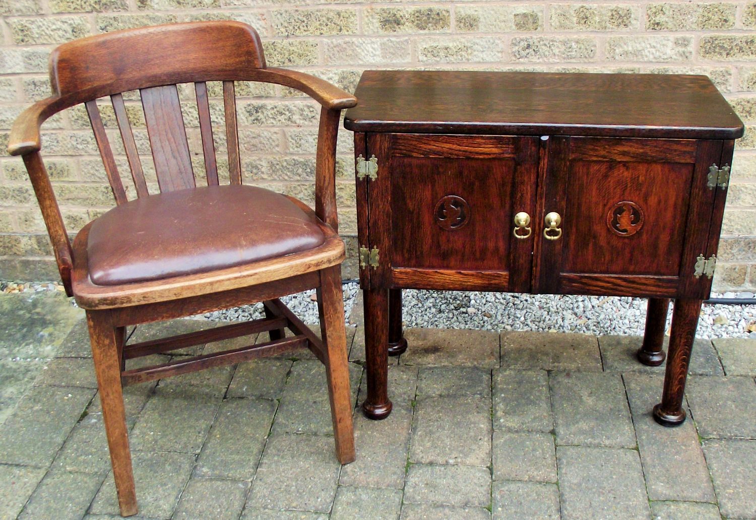 Unusual small vintage oak side table raised on block legs with 2 doors brass fitting motifs to doors + Vintage oak farnhouse armchair with leather seat .