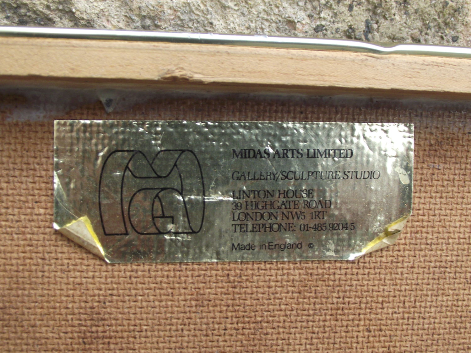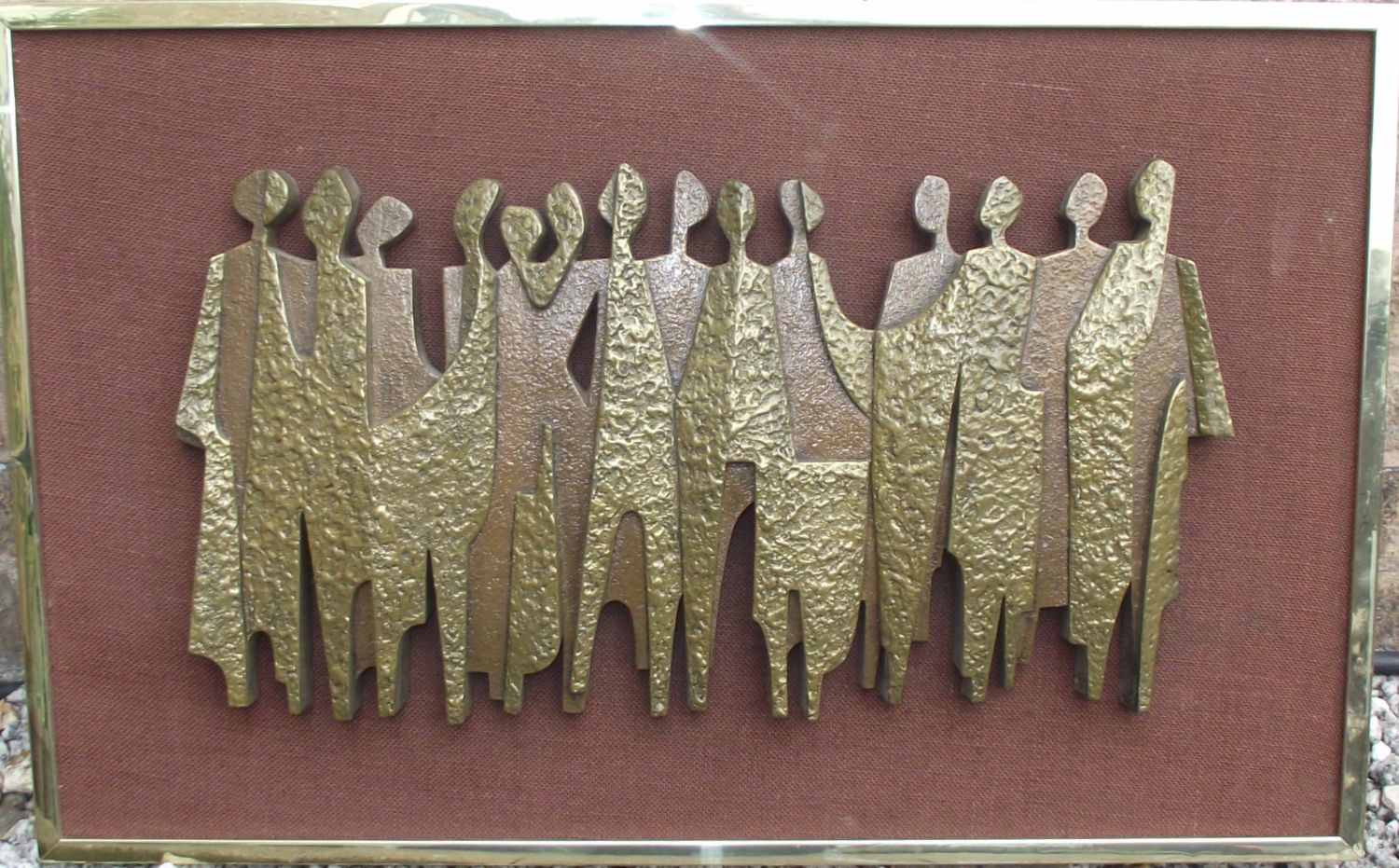 Unusual 1960s style framed artwork , raised metalic figures standing and mingling together fixed on a frame base with metal frame