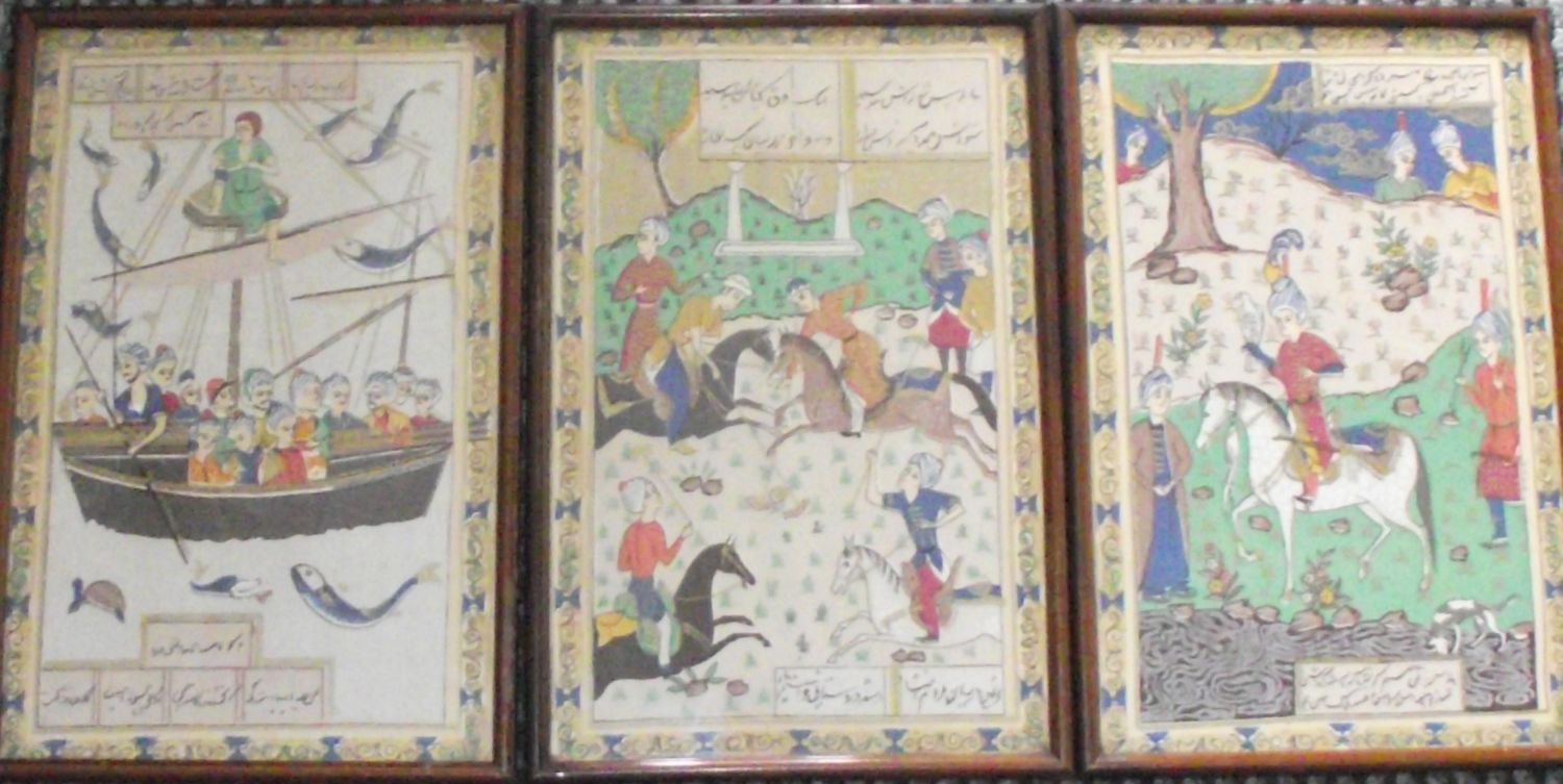 3x Rare framed & glazed 19THC Persian Qajar period style painted silk miniatures( silk overpainted and highlighted) 32x21cm approx