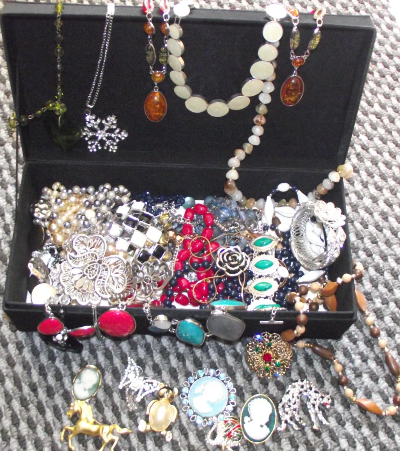 Velvet coloured jewellery box of costume jeweller, brooches , necklaces , bangles etc.