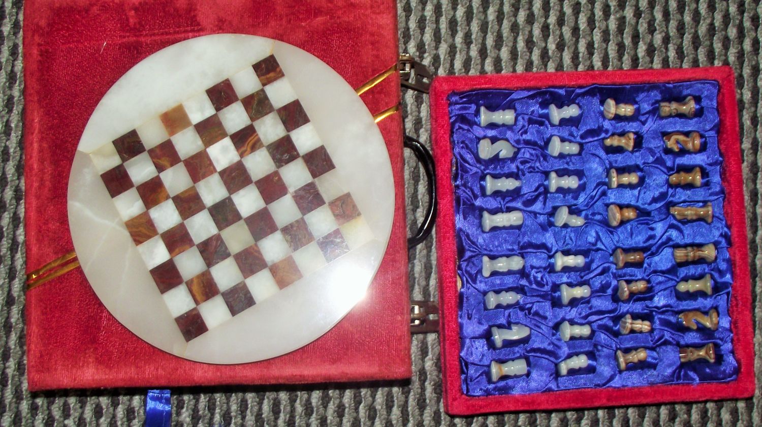 onyx style chess set with circular board in red velvet carry case