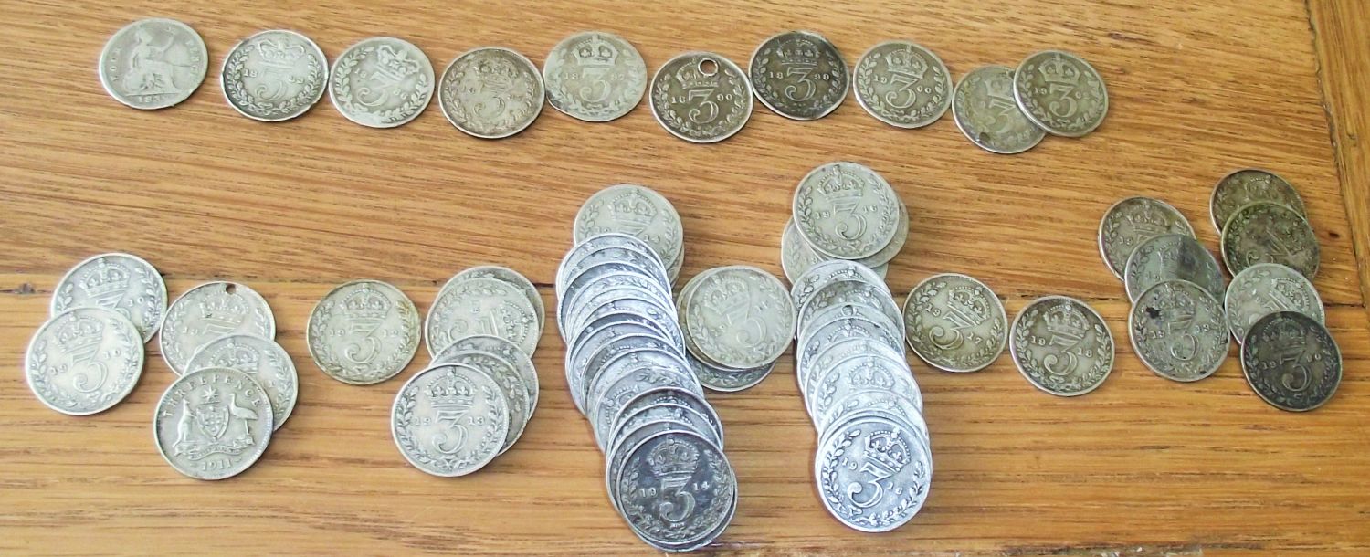 71 x old pre 1920 silver Victorian ,edwardian three pence pieces ( vic 1838,83,86,87,90,97,99 1900,1902,) ( 1910,11,12,13,14,15,16,17,18,19,20) including single 1911 Australian silver three pence