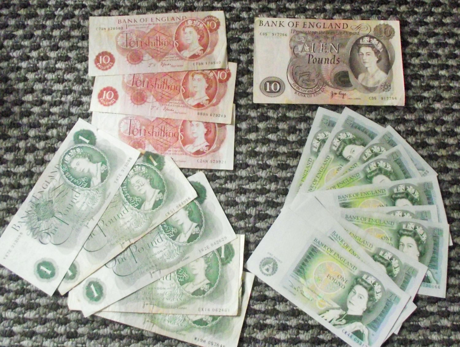 Cashier PAGE 1971 Ten pound banknote +16 old £1 notes + 3x ten shilling notes