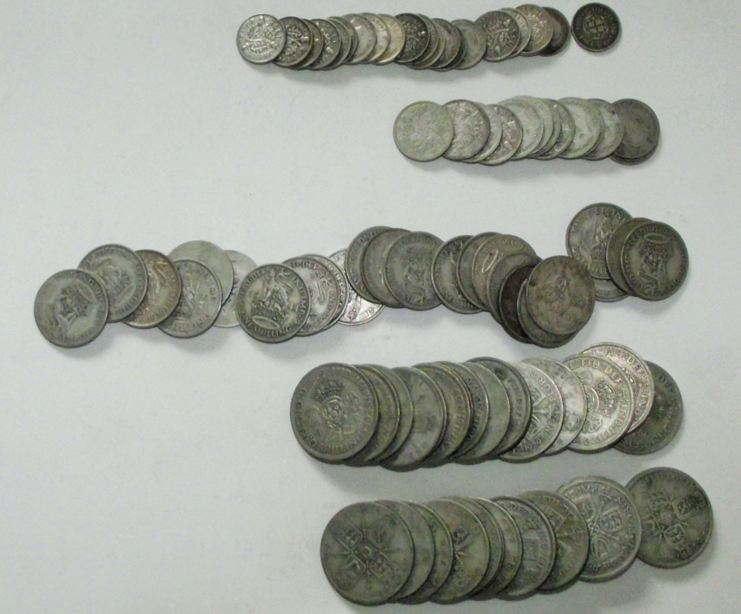 Large amount of 50% silver british coins inc 3 pence , 6 pence ,shilling & Florins all pre 1946 560g gross approx