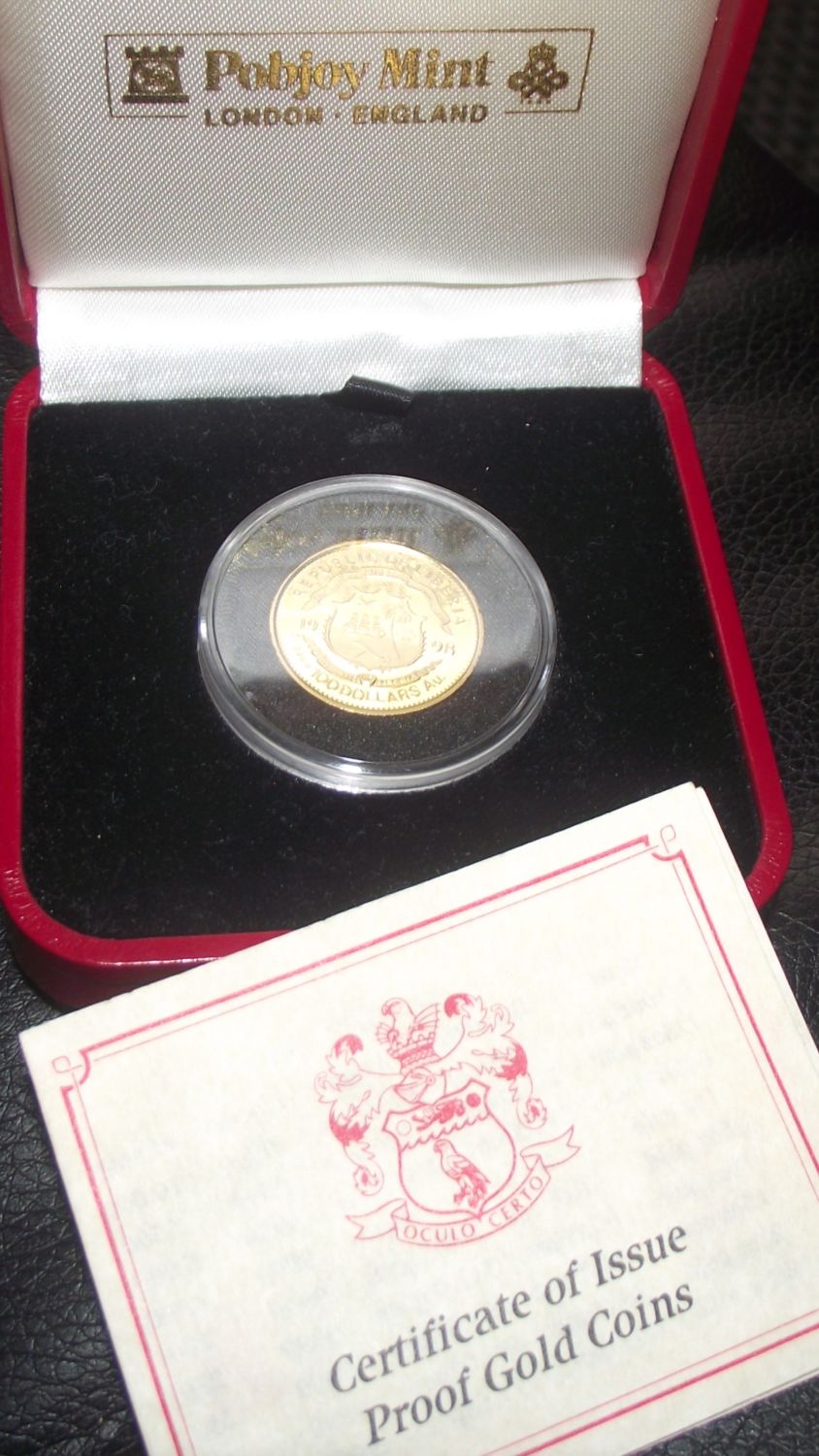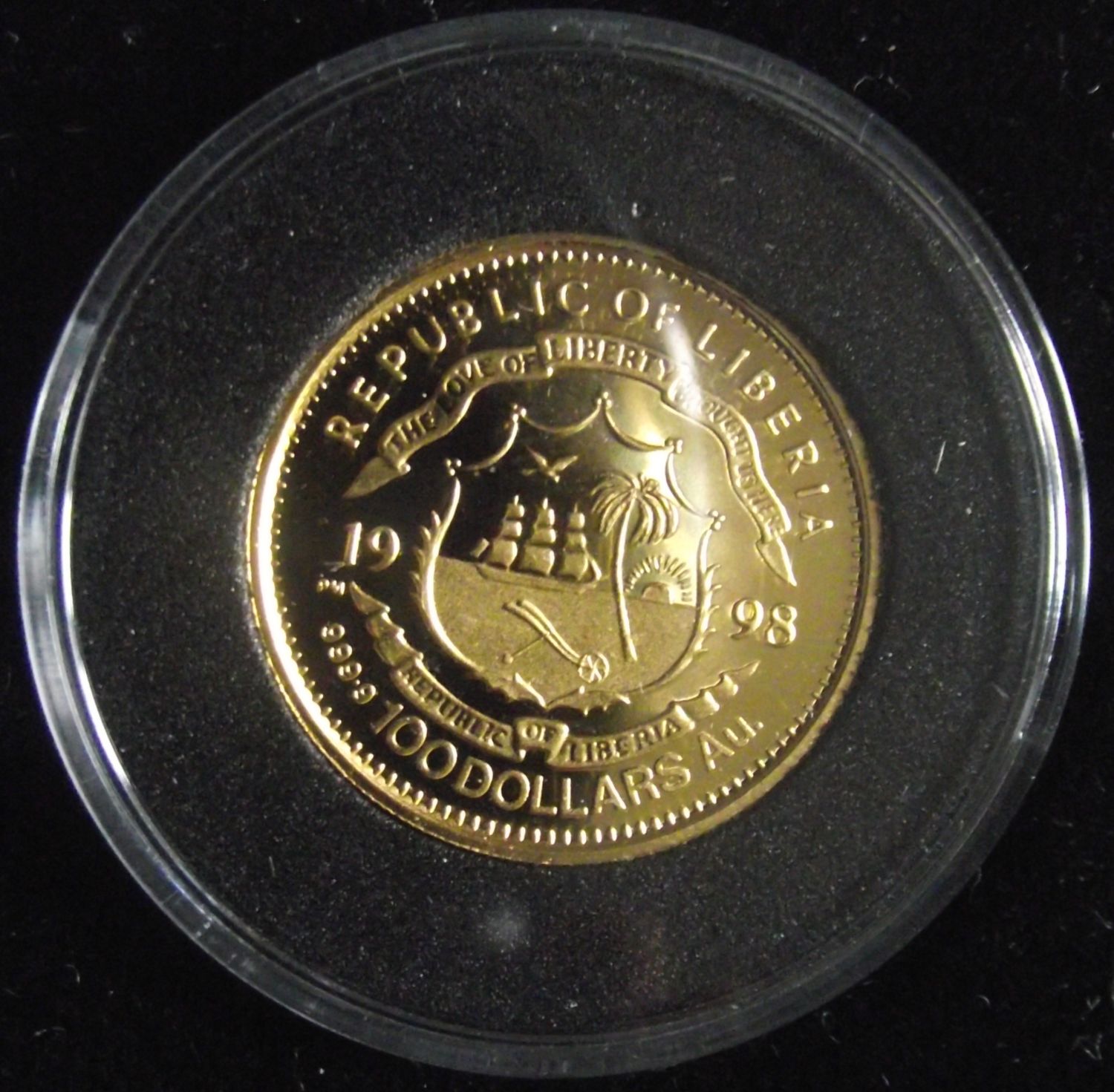 pobjoy Mint 1998 HMS Titanic Republic of Liberia 100dollars 1/5 Crown Proof Gold coin 999.9 purity 22mm diameter 6.22g approx issue limit 7500 in sealed case with certificate authenticity