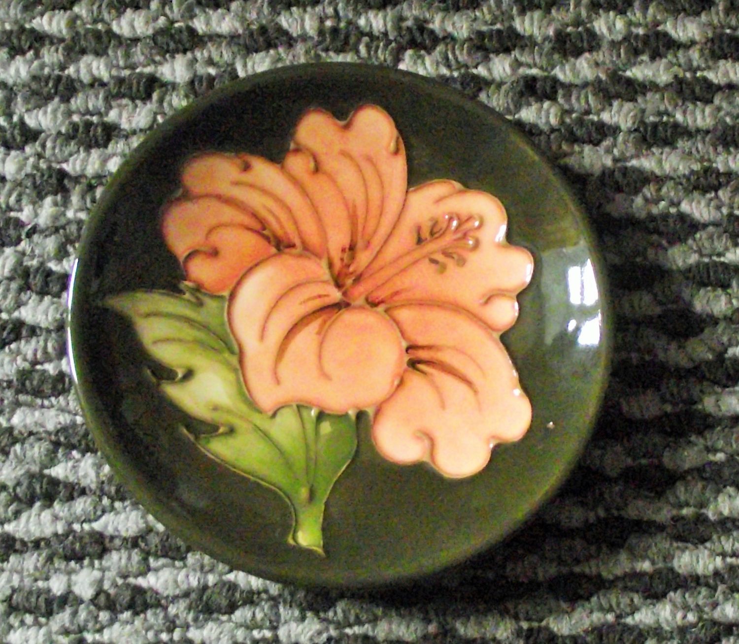 small 12cm diameter green ground Hibiscus pattern Moorcroft dish impressed Moorcroft with Arrow mark ( 1991)
