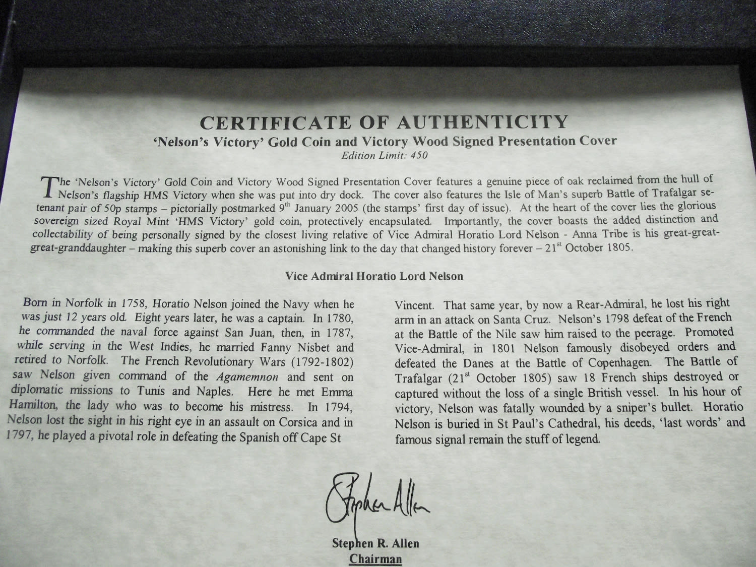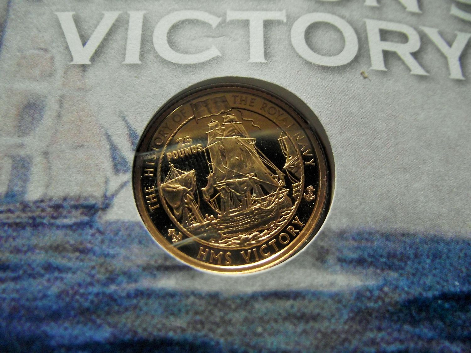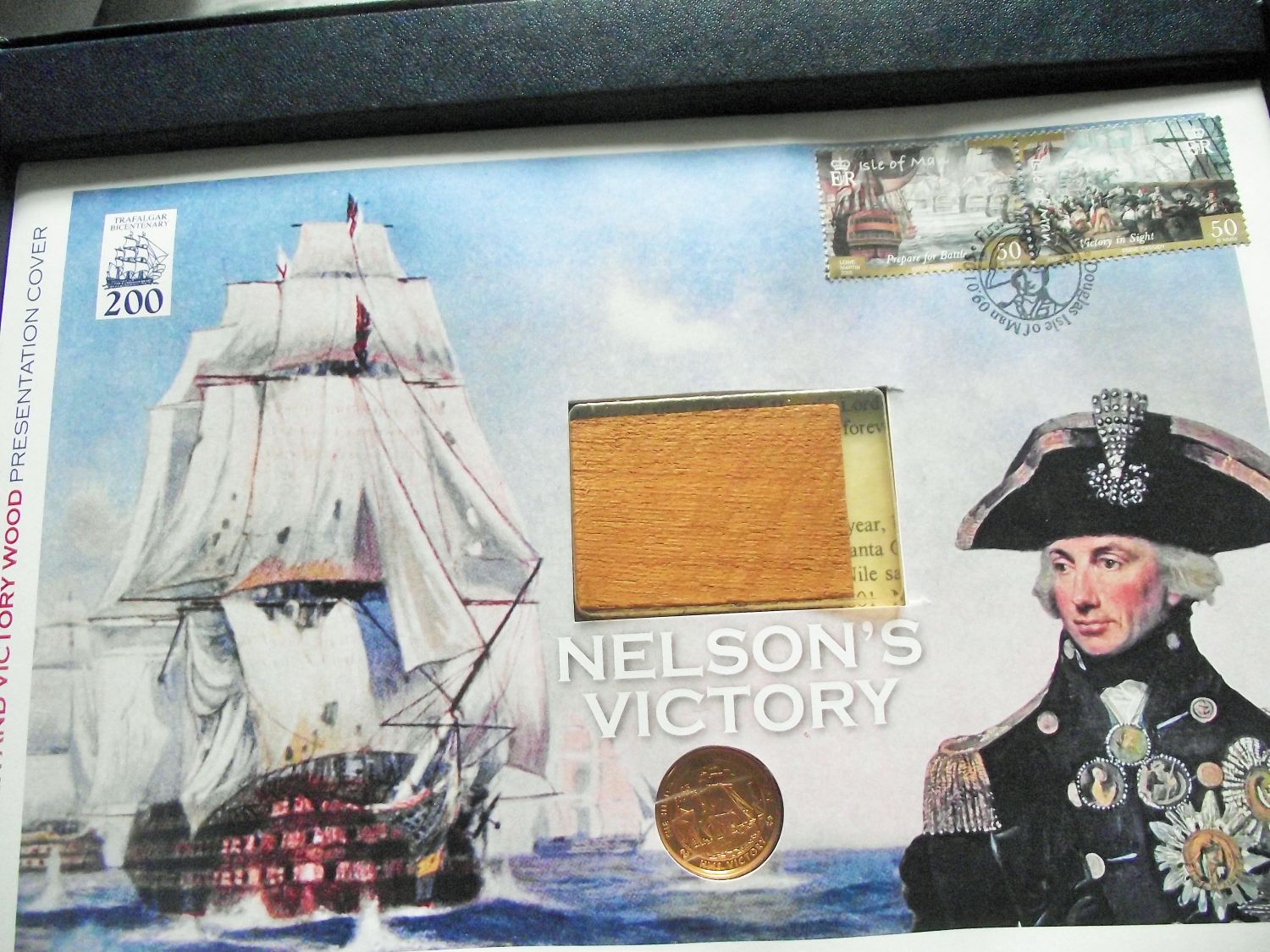 Nelson’s Victory’ £25 Gold Proof Coin and Victory Wood Signed Presentation Cover Ltd edition no 34/450 ty 9167(22ct)purity – 22.05diameter -7.98g