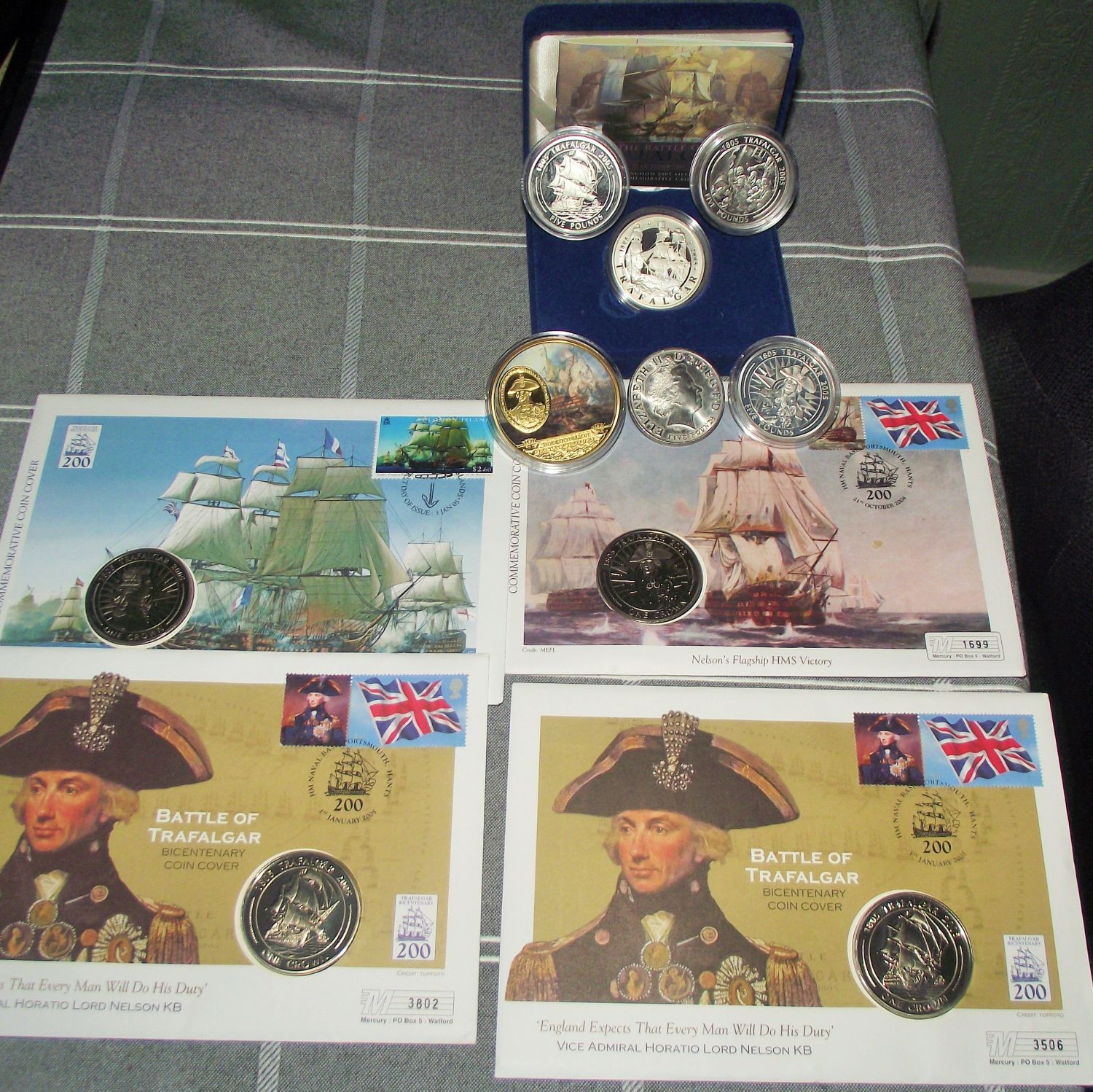 4x trafalger £5 proof coins ( 3 in sealed cases & 1 loose ) +250th Anniversary Of The HMS Victory 24K Gold Plated Coin Limited Edition+ 2 sealed Battle of trafalger bicentenery coin cover +2x rafalger commemerative coin covers + 2005 sea;ed trafalger £5 coin