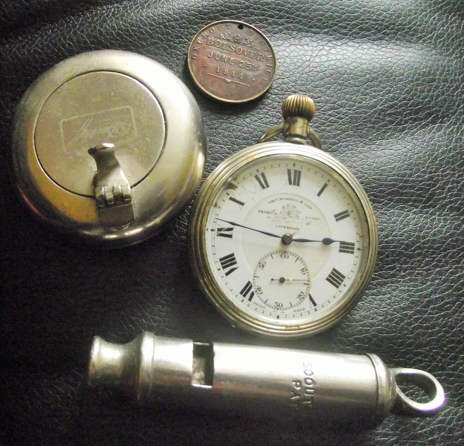 Plated Thomas Russel & Son Tempus Fugit top wind pocket watch. ( Start /Stops ) + vintage Davidoff portable ashtray +1914 Bolsover Derbyshire Oxcroft district royal visit medal – Description June 25th 1914 Bronze 27mm Medal commemorating the Royal Visit of King George V and Queen Mary to Bolsover + Scout master patent whistle